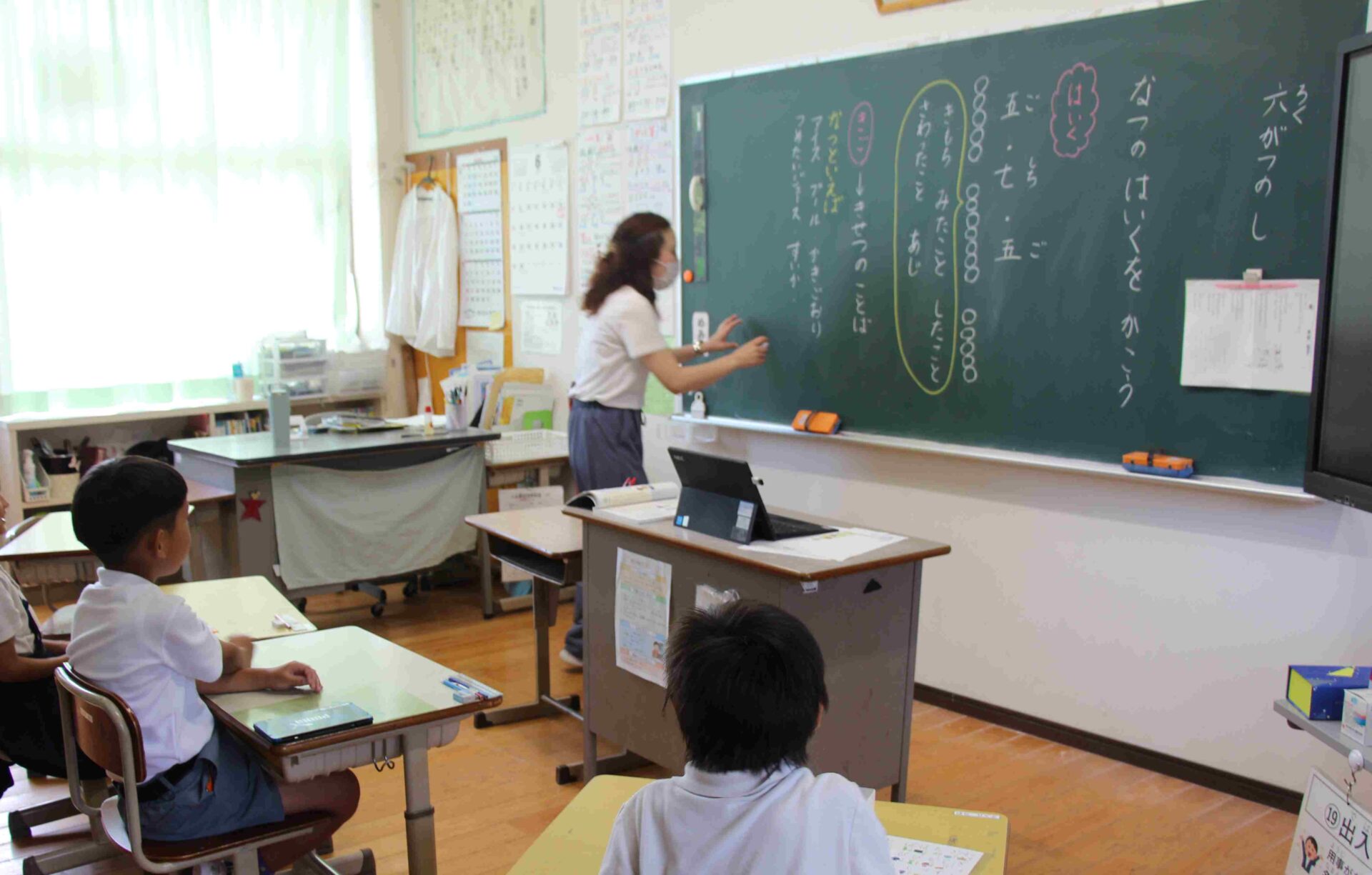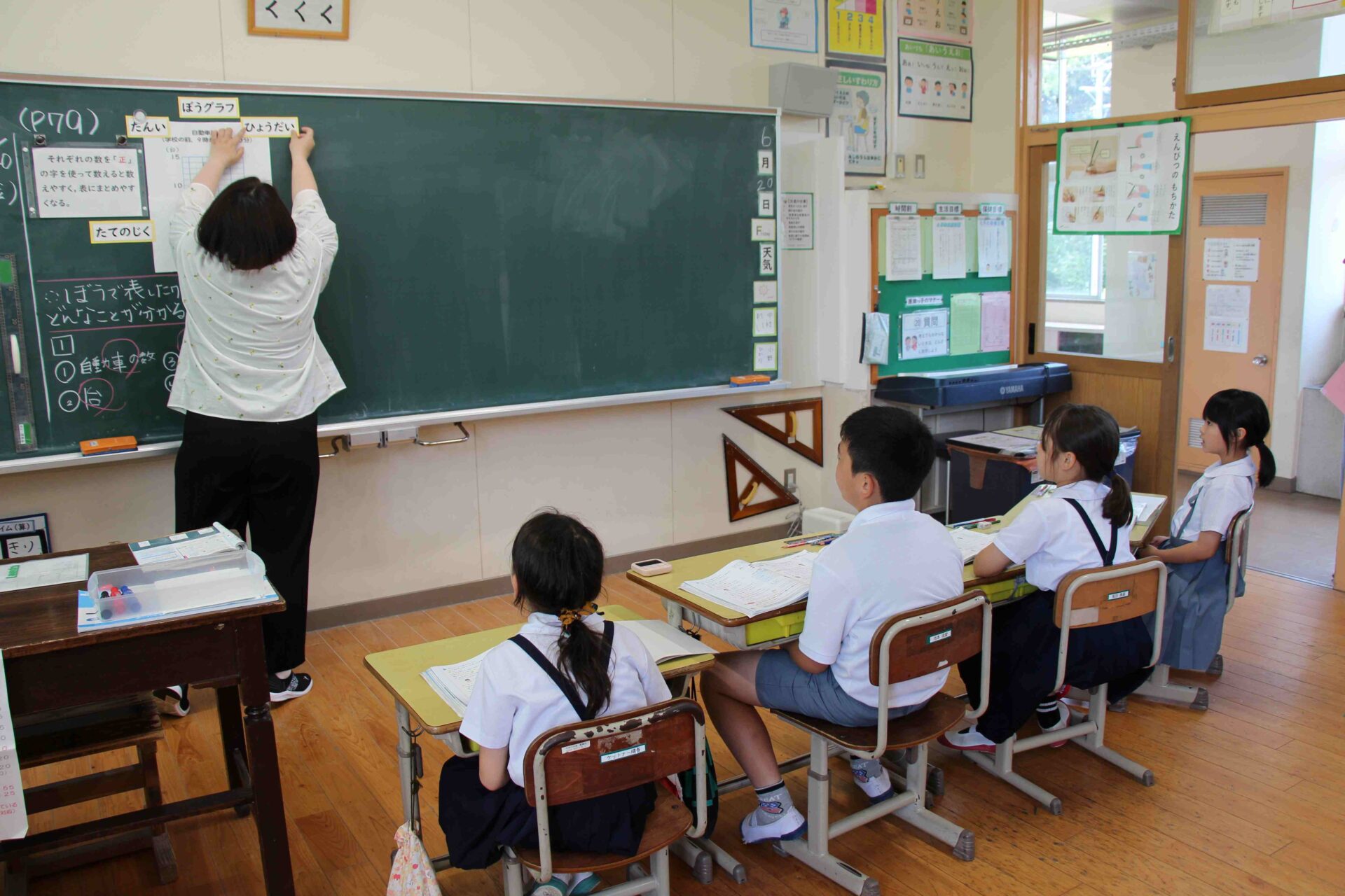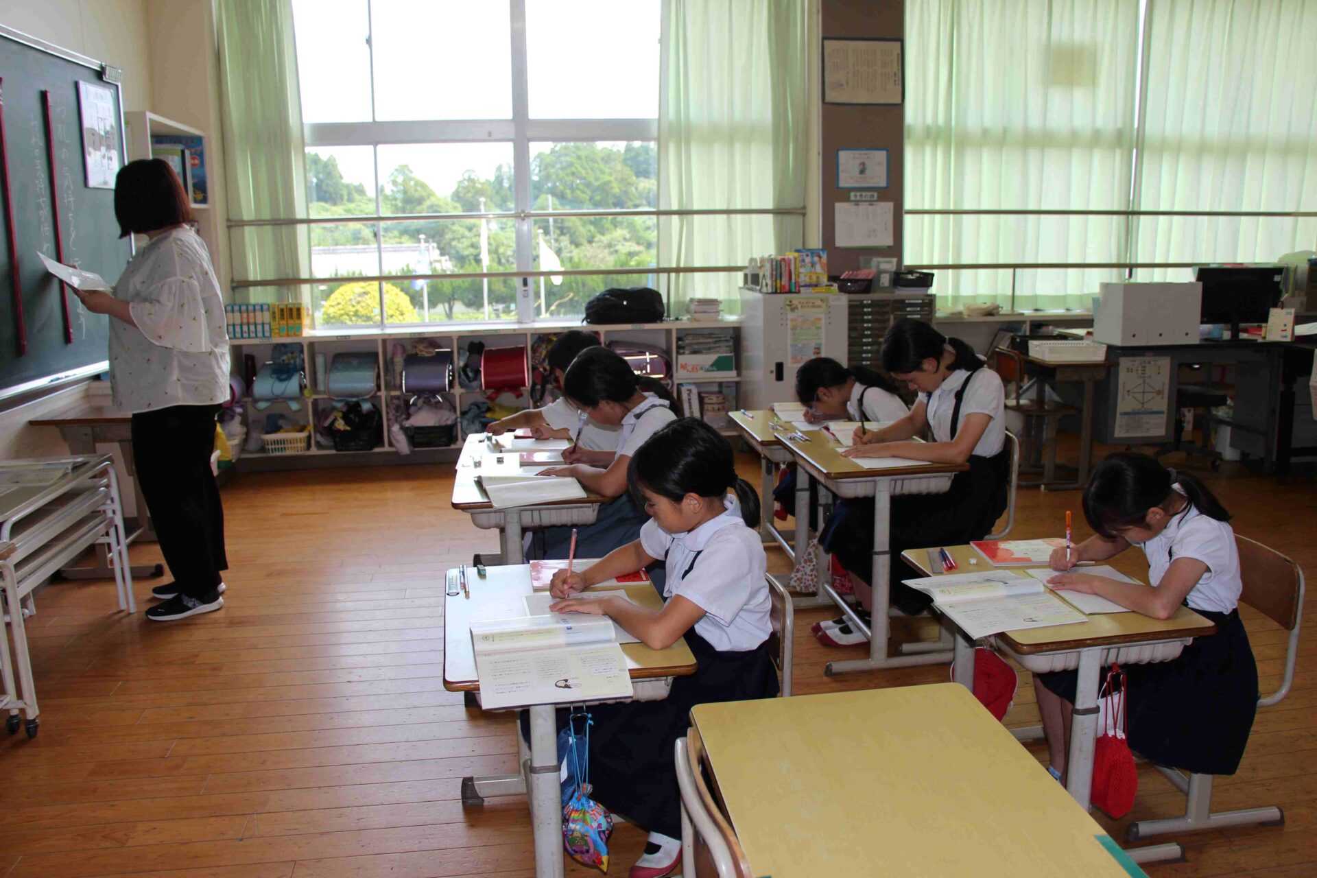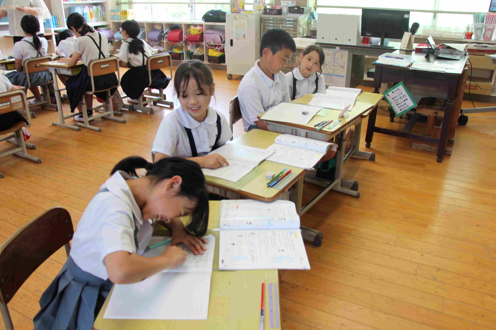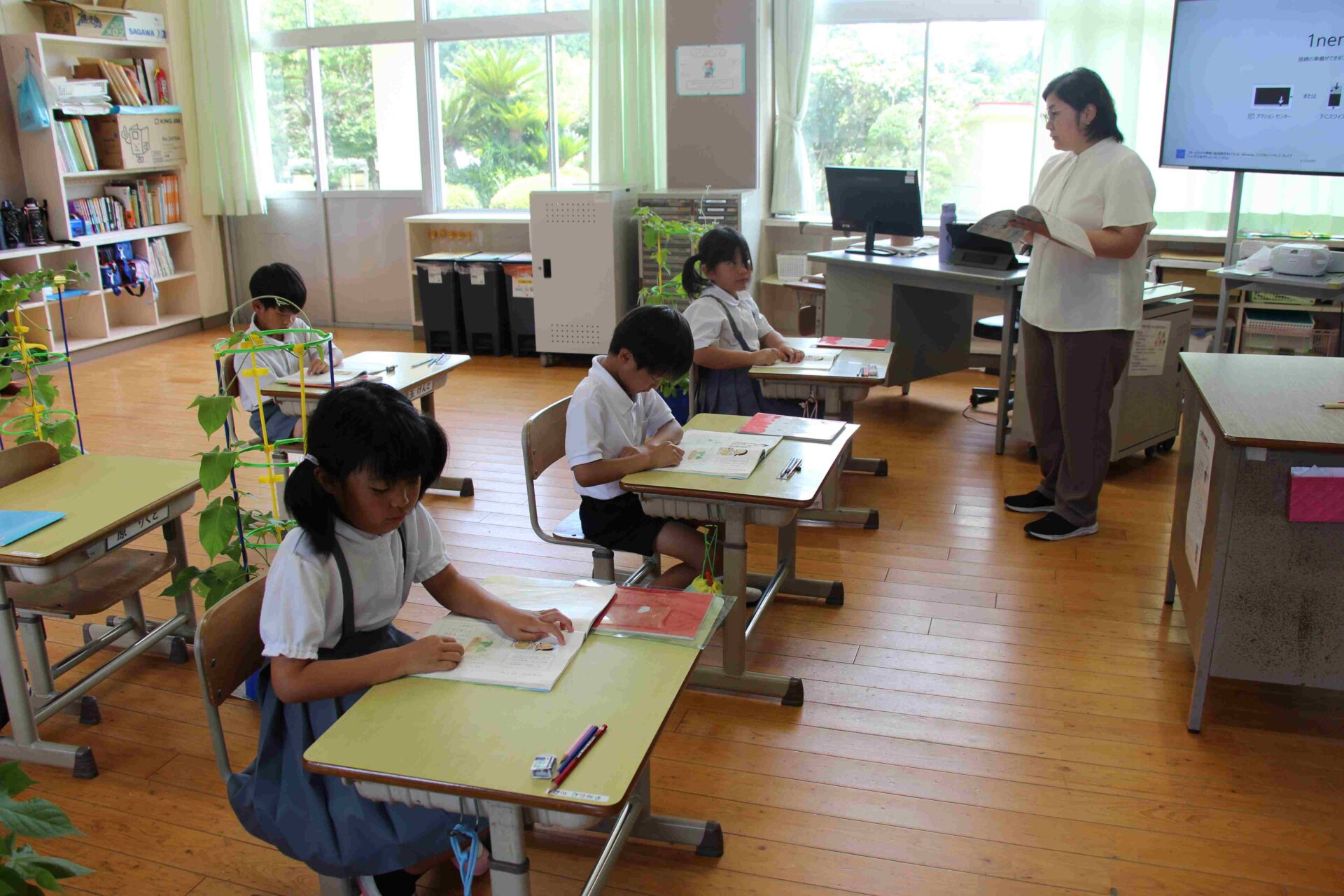 3・4年生の複式学級は,3年生は算数,4年生は国語の学習です。複式学級なので,片方の学年が先生と学習している間,もう片方の学年は自分たちで学習します。