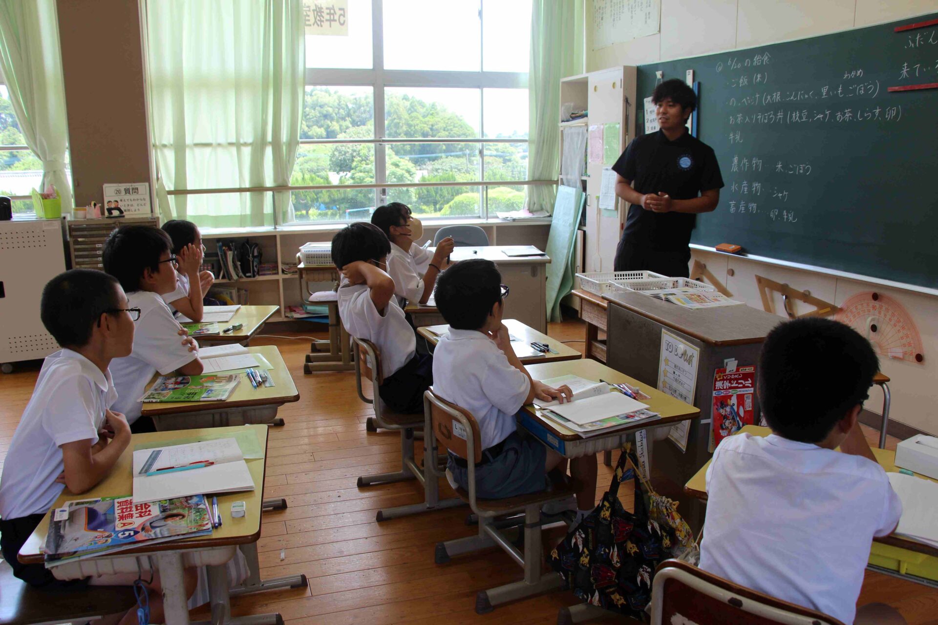 5年生は社会。普段食べているものは,どの都道府県からやってくるかの学習です。今日の給食の食材から予想していました。その後,スーパーのチラシを見て,野菜や果物などがどこ産なのか,日本地図に貼っていました。