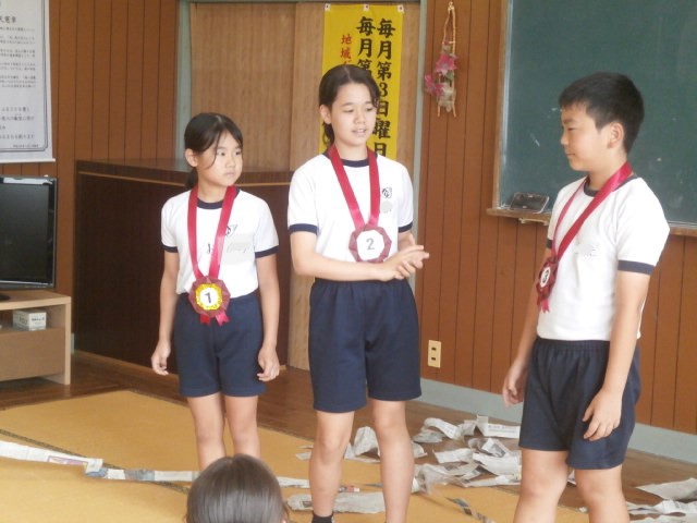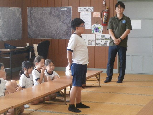 6月27日金曜日,3・4年生がふれあいサロンで,校区の高齢者の方々と交流しました。最初に自己紹介。名前と祖父母の名前を述べました。