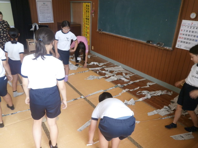 2つめは,紙鉄砲づくりです。チラシを使って作りました。サロンの方が丁寧に教えてくださり…「エイ!!」「鳴ったぁ。」「鳴らなーい。」「ここを持つのよ。」最初はうまくできなかった子も,教えてもらいながら鳴らすことができました。