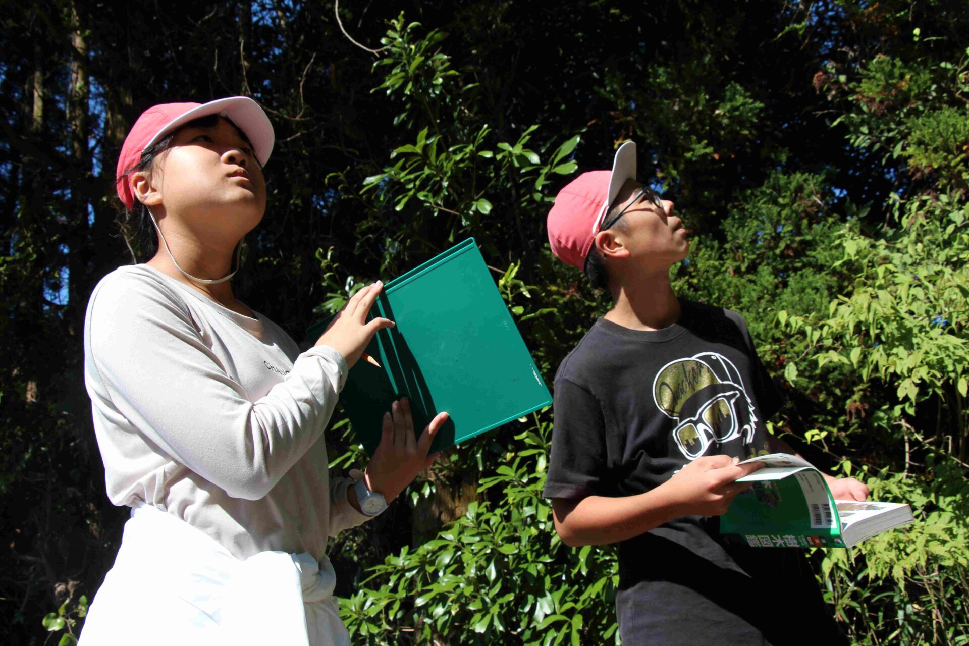 出会いのつどいを行い,グリーンアドベンチャーをしました。地図を見ながら番号の木を探し,名前をあてます。地図と山道とが一致せず,とても苦労していました。