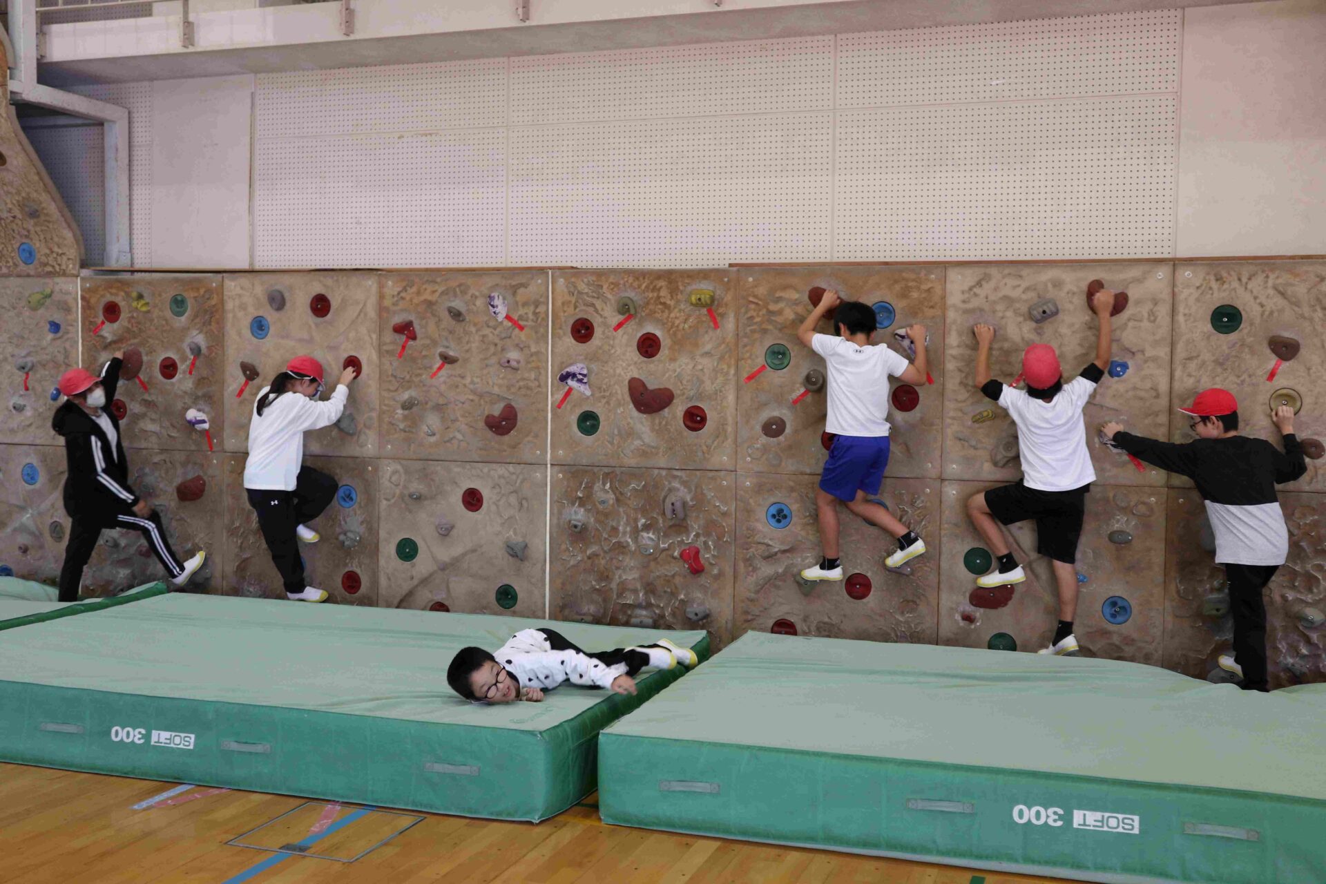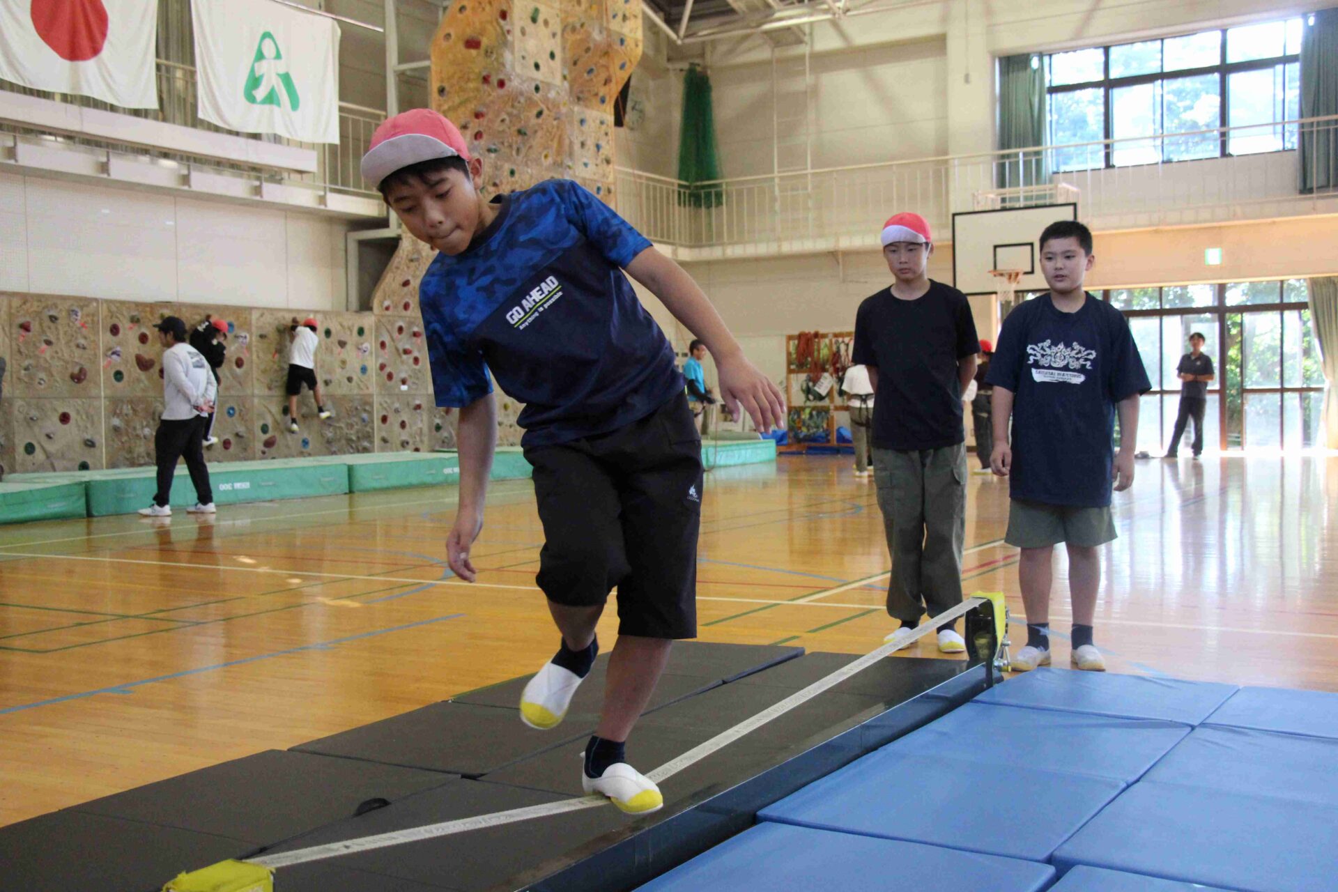 お昼ご飯を食べた後は,体育館でボルダリングとスラッグラインです。ボルダリングは,どこに手を置いたらよいのか,足はどうするのか考えながら挑んでいました。スラッグラインは,バランスを取りながら最後までいけるか挑戦していました。