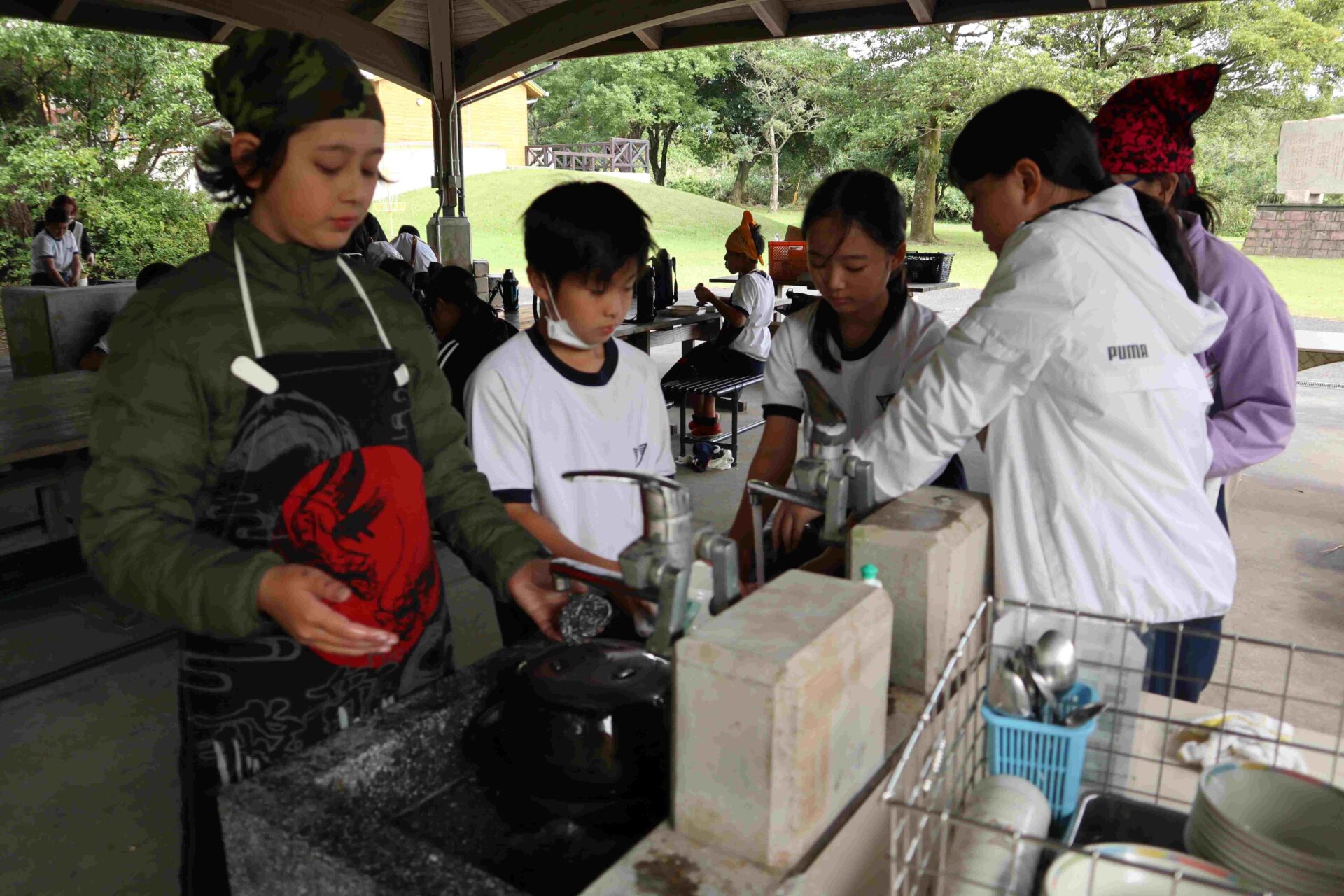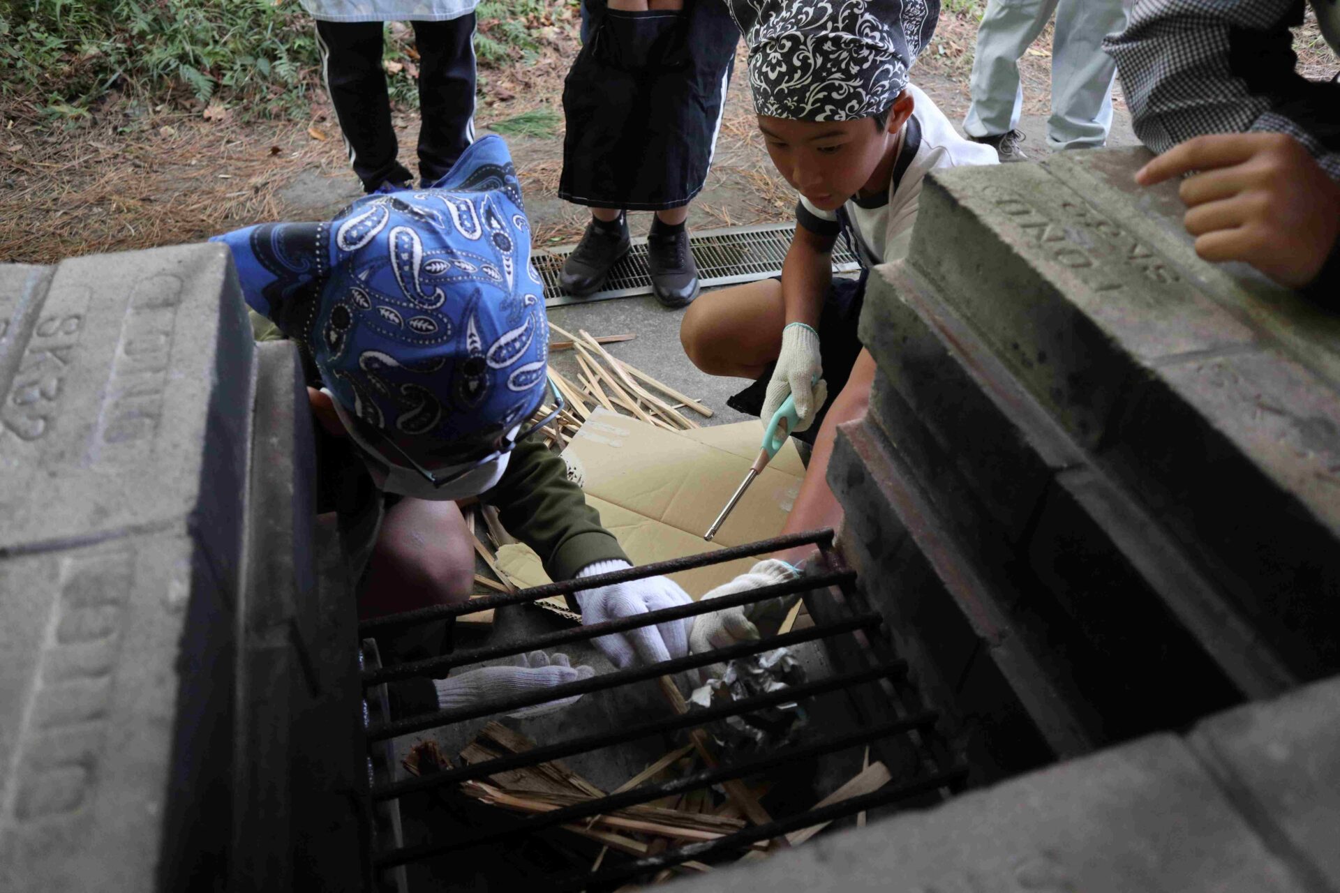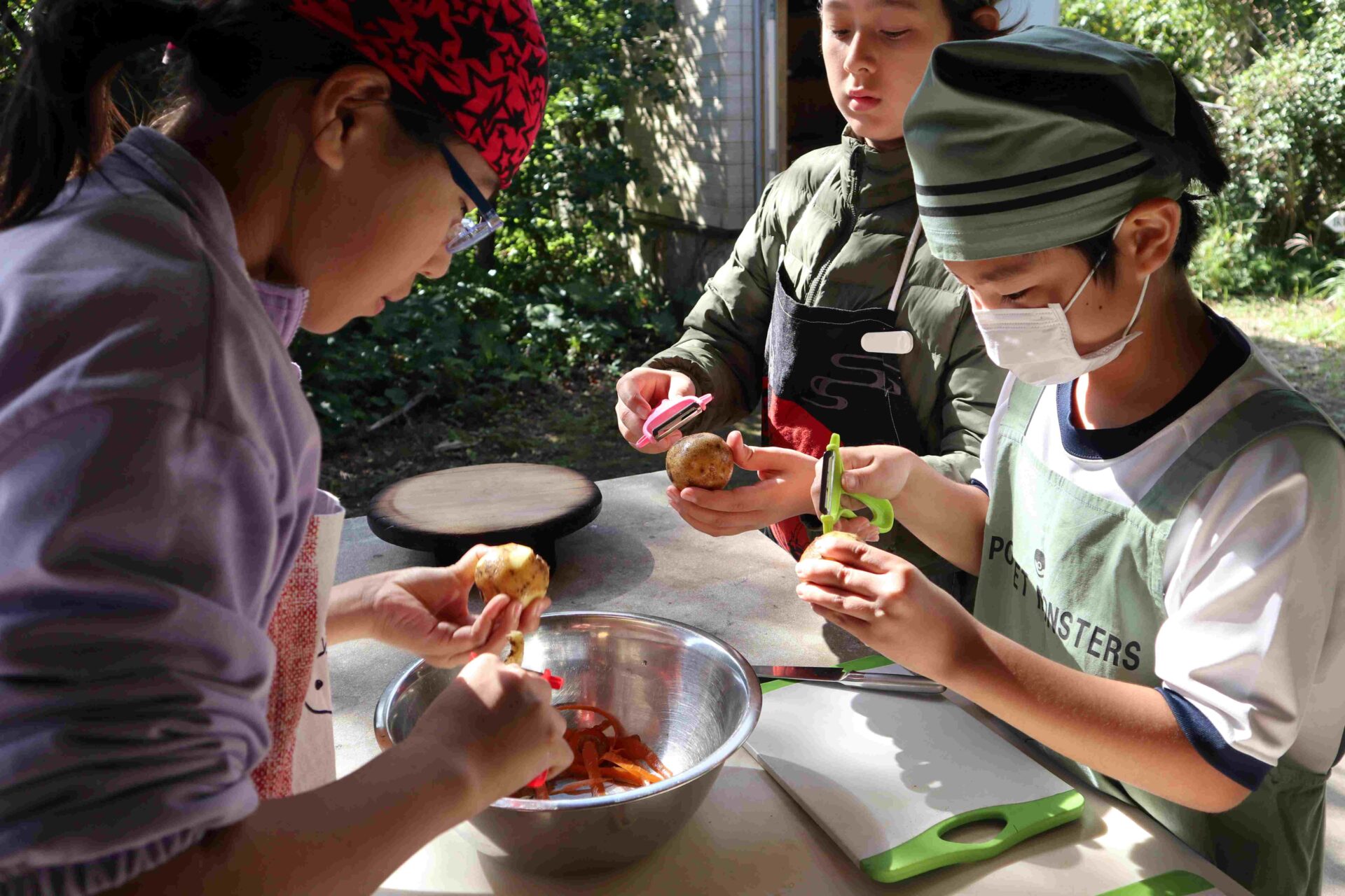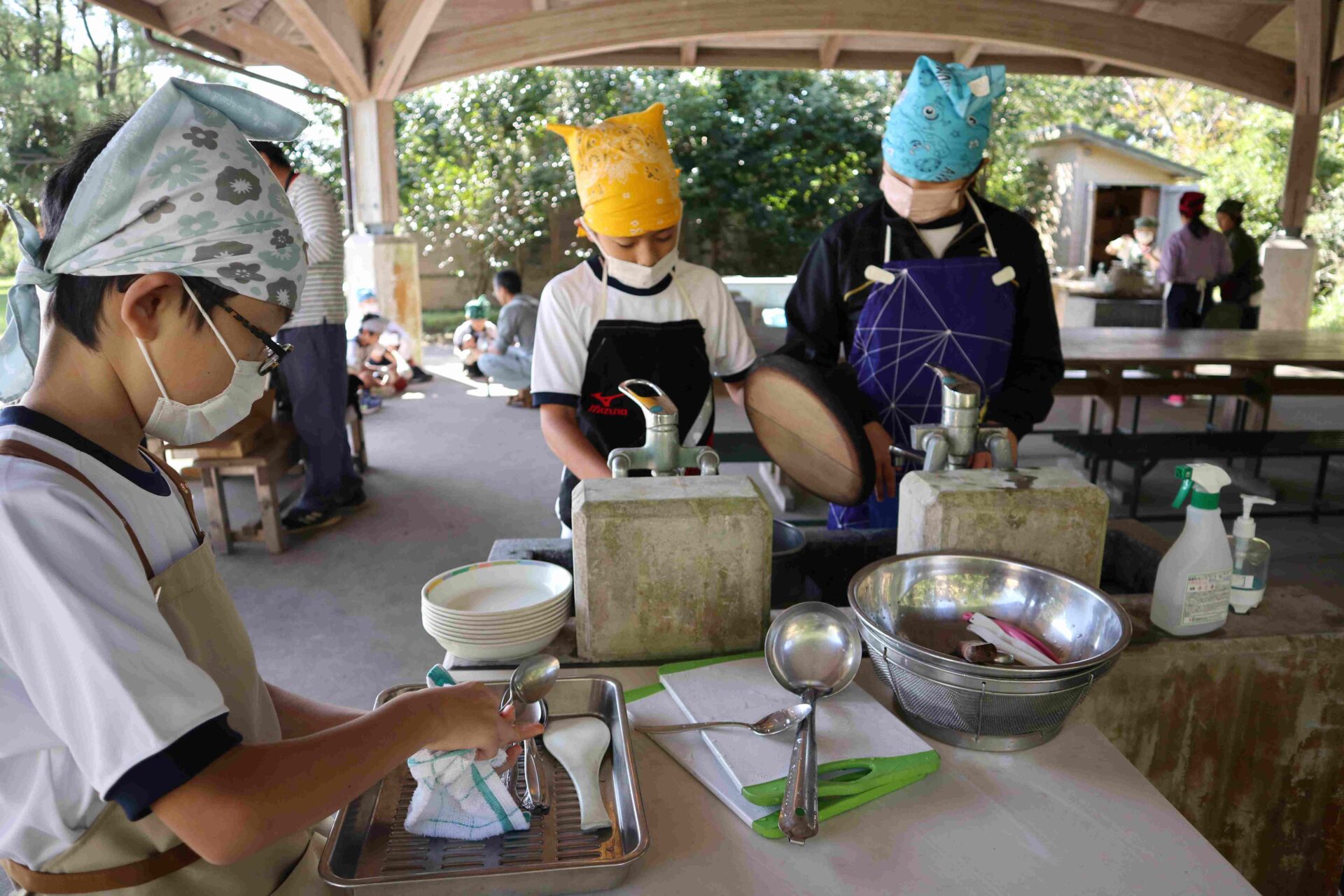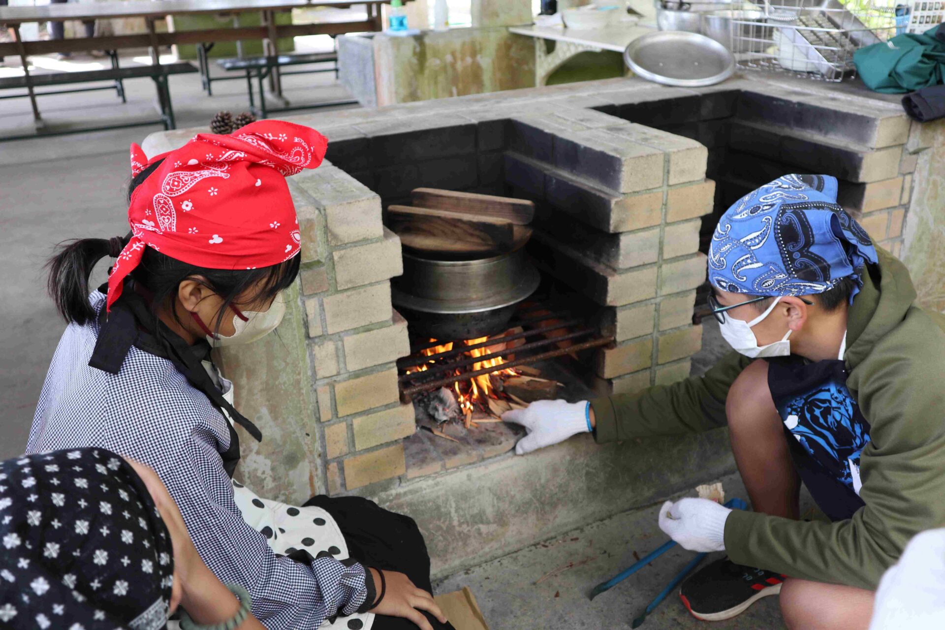 薪係は,どのように火をつけるのか,薪割りから教わりました。調理係は,使う食器や鍋を洗ったら,米を洗ったり,野菜を切り始めたりしました。かまどの準備もできたら,米を炊き始めます。そして,カレーの具を煮始めました。