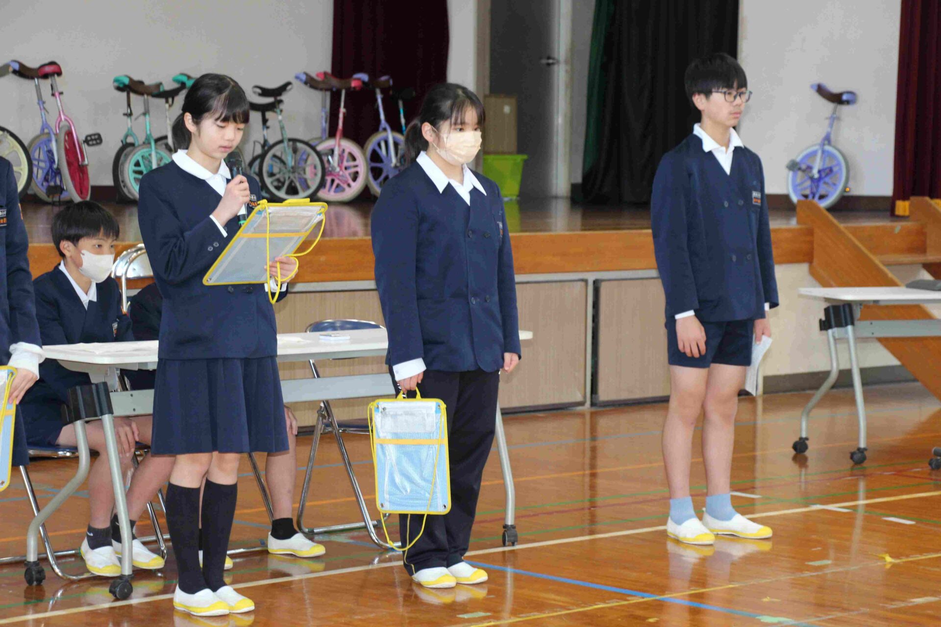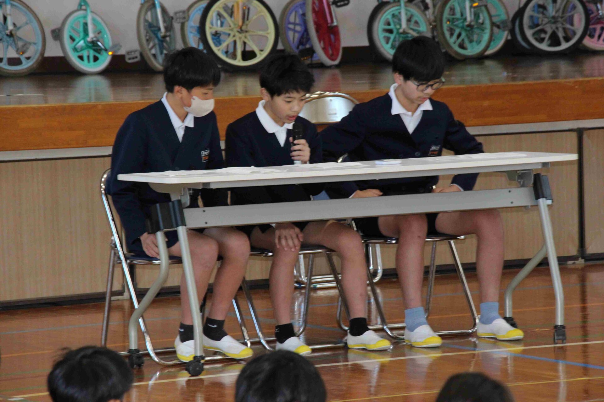 まず最初に,各委員会の活動反省です。活動報告と,全校児童がよりよく過ごすことができるためのお願いを,5つの委員会の委員長が発表しました。