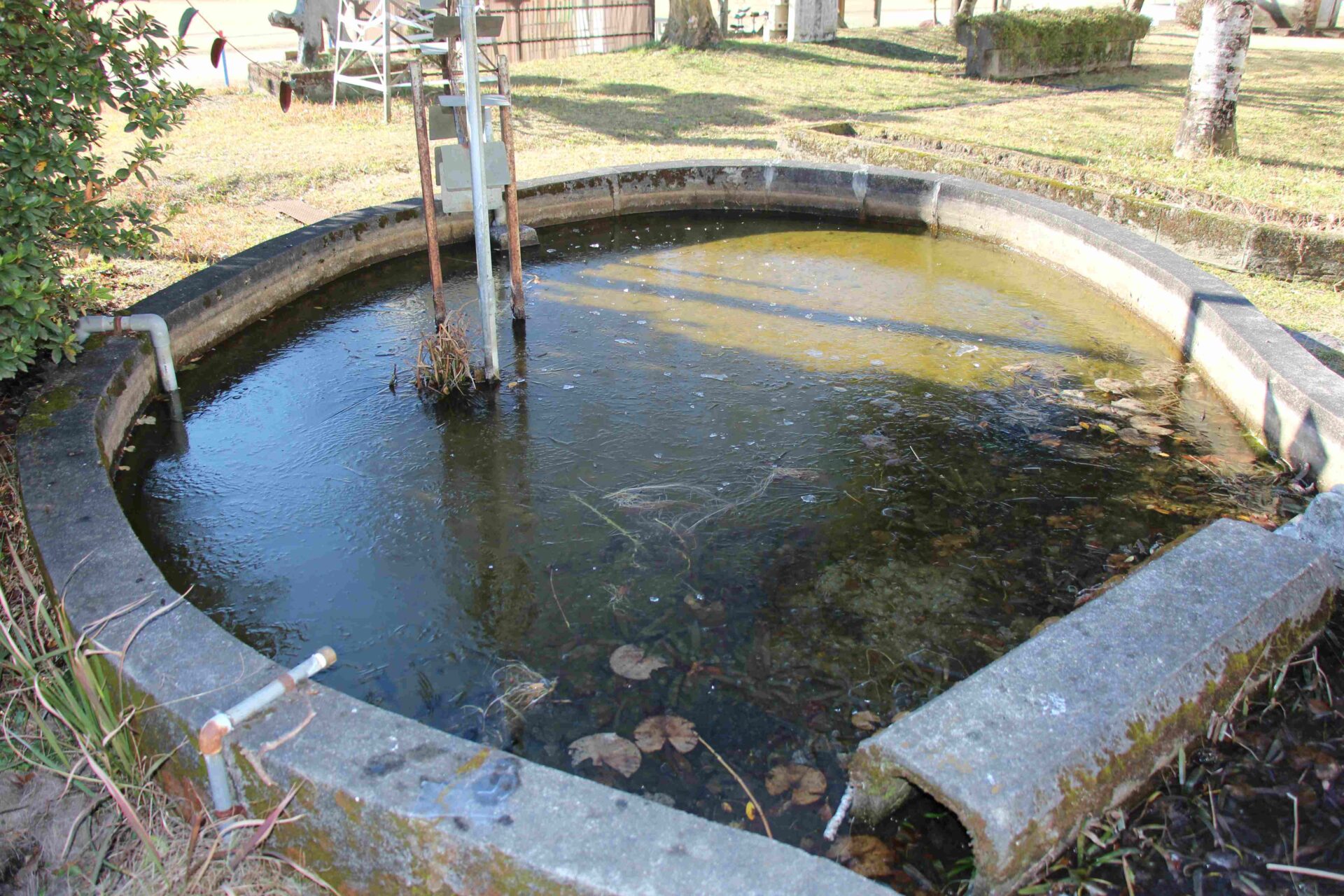 朝はとても寒かった原田地区。学校の池の水が凍っていました。