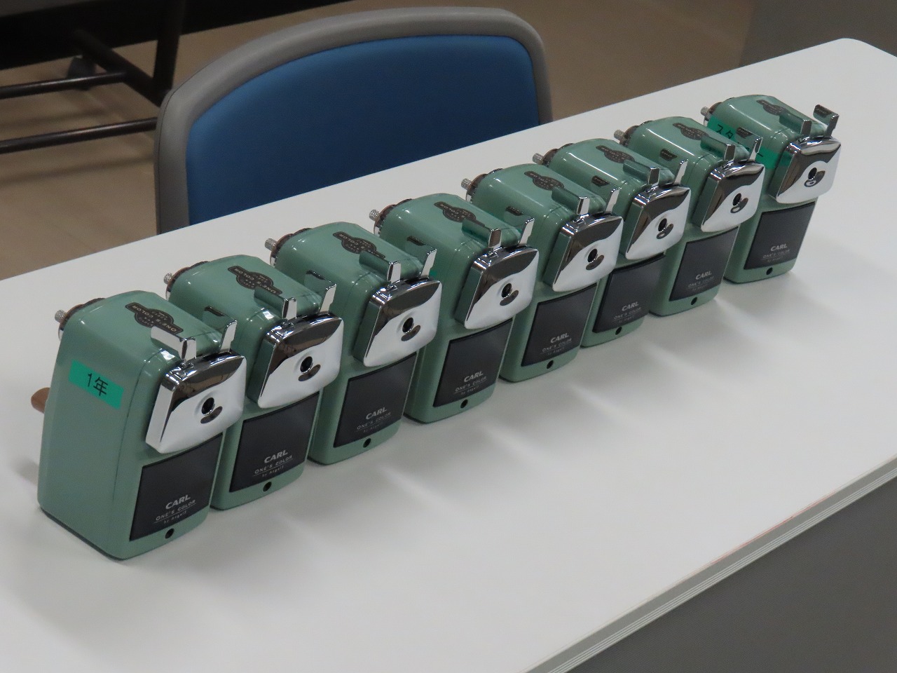 先日,来校された古希のみなさんからのプレゼントが来ました。いつものように「何に使いたいか」公募します。今回は,各学級に「鉛筆削りが欲しい」という案を採用しました。