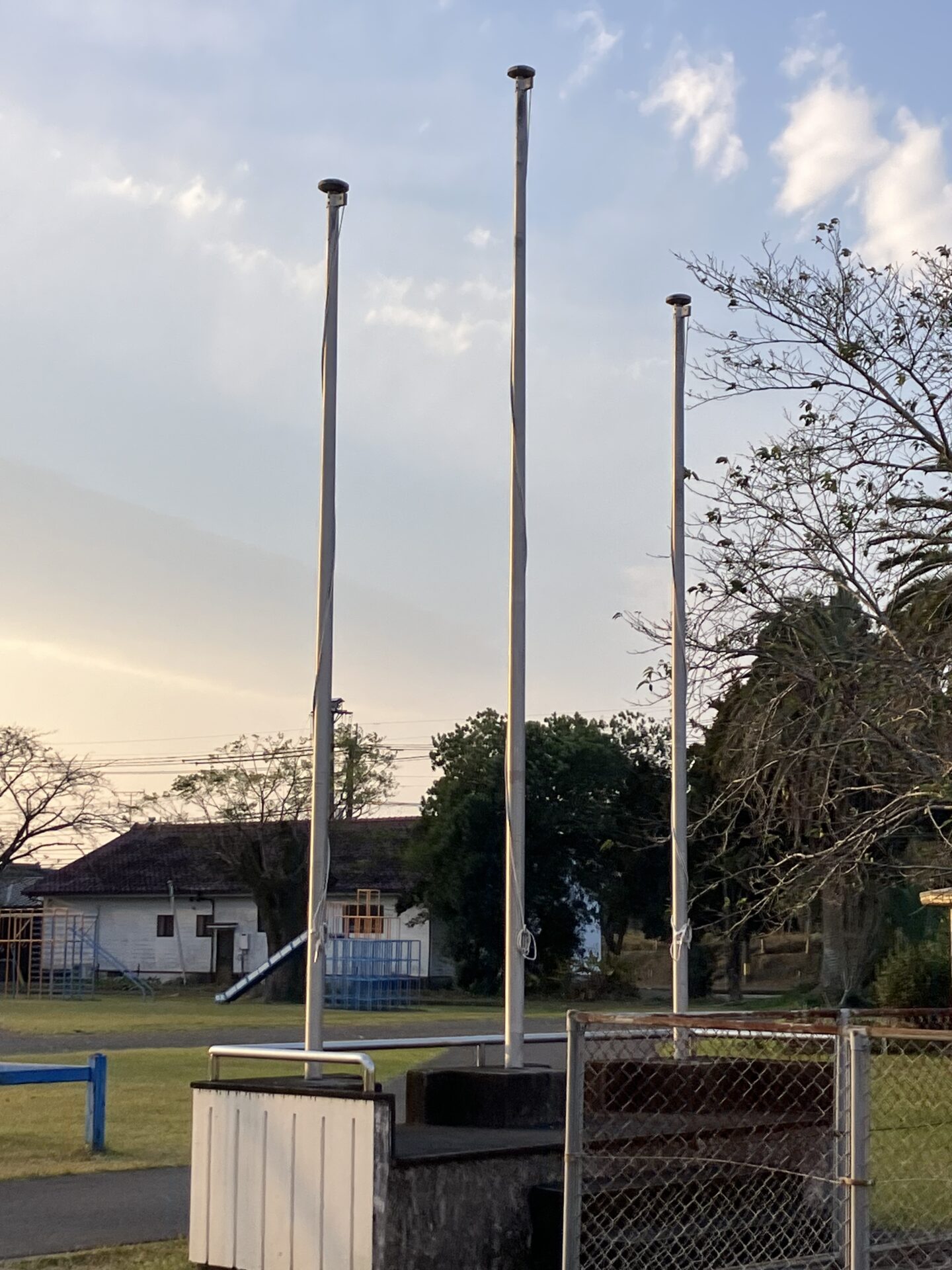 掲揚台の3つの旗は、毎朝、総務委員会の児童が揚げてくれています。本来、国旗や校旗の掲揚は校長が責任を持って行うべき職務であり、それを職員が分担し、さらに児童が特別活動の一環として担ってくれているものです。そして,私たちは、こうした活動を通じて、子どもたちのより良い成長を期待しています。