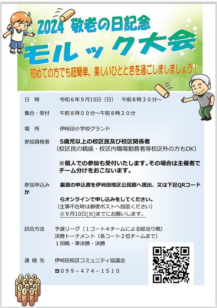モルック大会に出場する仲間を募集しています。 作成者 isakidasyou_admin公開日 2024年9月5日2024年9月5日 9月15日(日)の午前中,小学校グランドで,「敬老の日記念モルック大会」が伊﨑田校区コミュニティ協議会の主催で開催されます。 3人1チームで出場します。校長先生も出たいのですが,いっしょに出る仲間がいません。ですので,出場してくれるお友だちを募集します。 チームの仲間になってくれる人がいたら校長先生まで声をかけてください。
