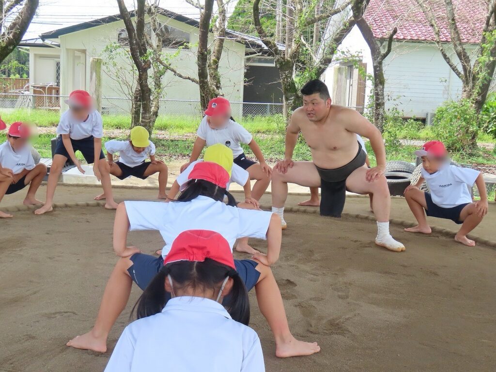 伊﨑田っ子は,その大会に向けて,体育で相撲の練習を行います。そして,金曜日は,伊﨑田相撲クラブの監督に「稽古」をつけていただきました。これは「稽古」です。
