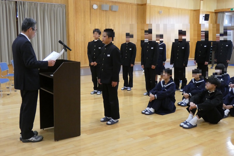修了式では、各学年の代表生徒が校長先生から修了証書をいただき、一年間の努力を称えられました。また、3人の生徒が3学期の反省と来年度に向けての抱負を語ってくれました。「有言実行」来年度の皆さんに期待していますね。