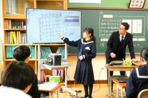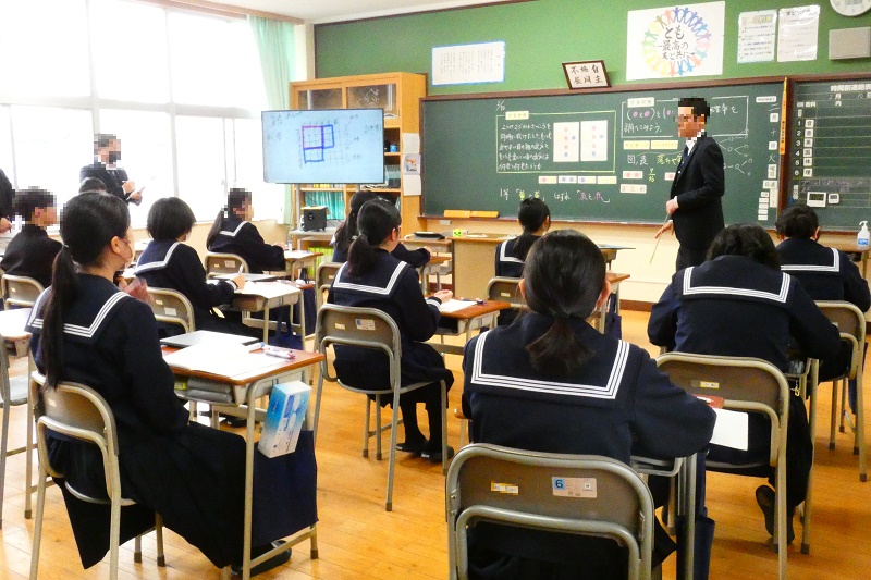 本校では2月10日(火)に少し特別な授業が行われました。市教育委員会のご協力のもと、附属中学校の先生をお招きし、「学習者主体の授業」をテーマにしたモデル授業を実施しました。