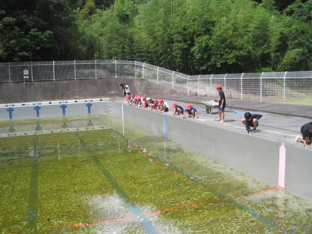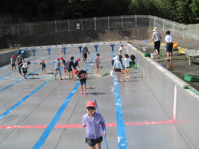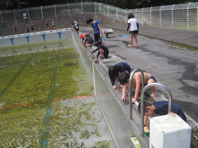 水泳学習を前に高学年がプール掃除を行いました。プールに沈んでいる葉っぱや枝を取り除いたり,壁に付いているこけをしっかり落とすことができました。掃除ですが全身ずぶ濡れになっている子もたくさんいました。さあ,楽しい水泳の学習が始まります。道具の準備をしっかりして体調を整えておきましょう。