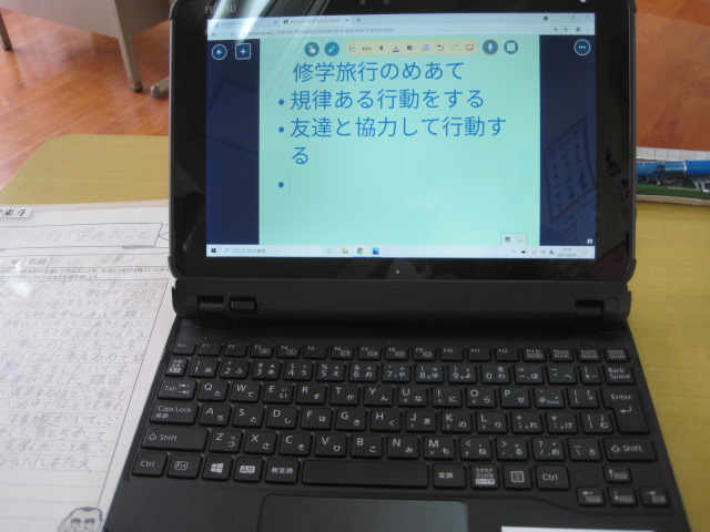 一人一台タブレットの使い方~修学旅行のまとめ~ 作成者 matsuyamasyou_admin公開日 2021年6月7日 6年生が早速修学旅行の事後学習に取り組んでいました。まとめは,一人一台のタブレットを使って,ロイロノートでスライドを作っていました。説明がなくても,子供たちはどんどん使用法を理解して学習を進めていました。また,操作方法をお互いに教え合う姿も見られました。発表が楽しみです。