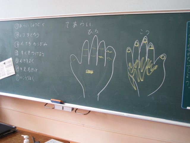 1年生が学活の時間に新型コロナウイルス感染症への対策について学習しました。手洗いチェッカーを使って,洗い残しが多い場所が分かると,汚れが落ちるまで手を洗っていました。手洗いや手指消毒,マスク着用,これまでも大切にしていたことをこれからもしっかりとしていきましょう。