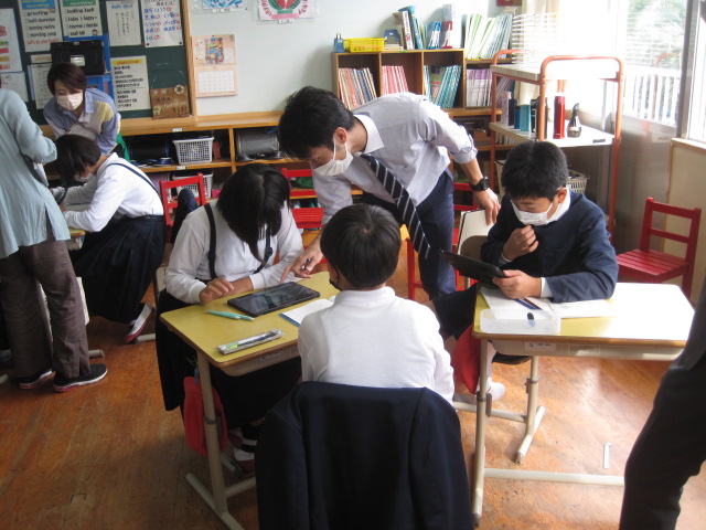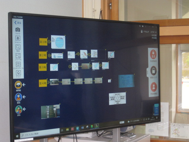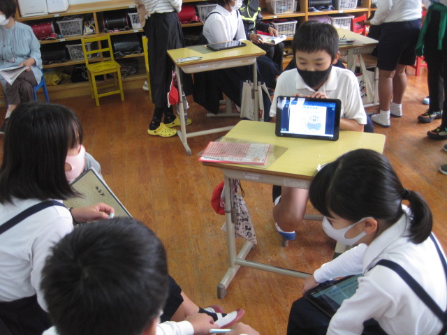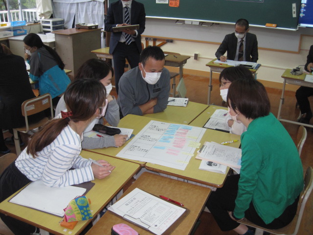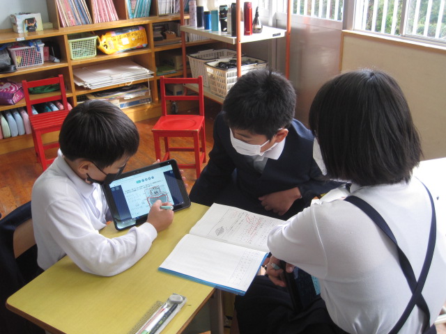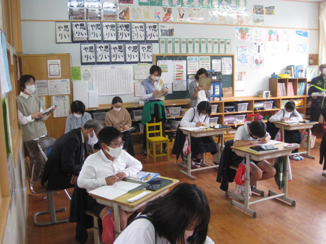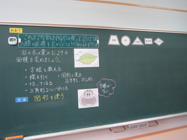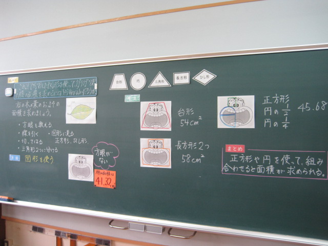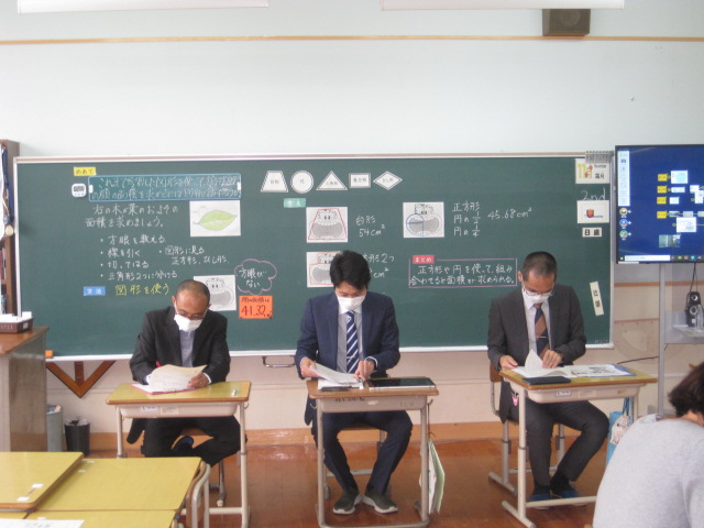 鹿大の和田准教授を講師に招いて,研究授業,授業研究を行いました。6年生の円の学習でした。複雑な形を見て,およその面積を求めるという内容でした。家庭学習と連動して子供たちがしっかりと見通しをもって学習に臨めるようにした導入,数学的な見方・考え方を働かせるために一人一台タブレットを使って行った学び合い,深い学びにつなげるためにダイヤモンド・サイクルで行った振り返りなどを通して算数科の授業の研修を深めました。一番よかったところは,子供たちが難しい課題に対して真剣に向き合い,途中で投げ出したりせずに最後まで前向きに,仲間と先生と協力して活動できたことだと思います。みなさん,よくがんばりました。