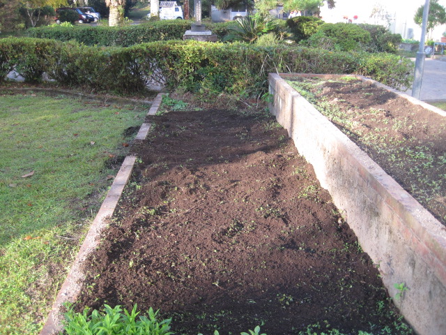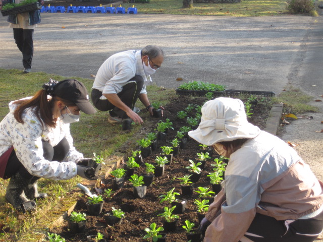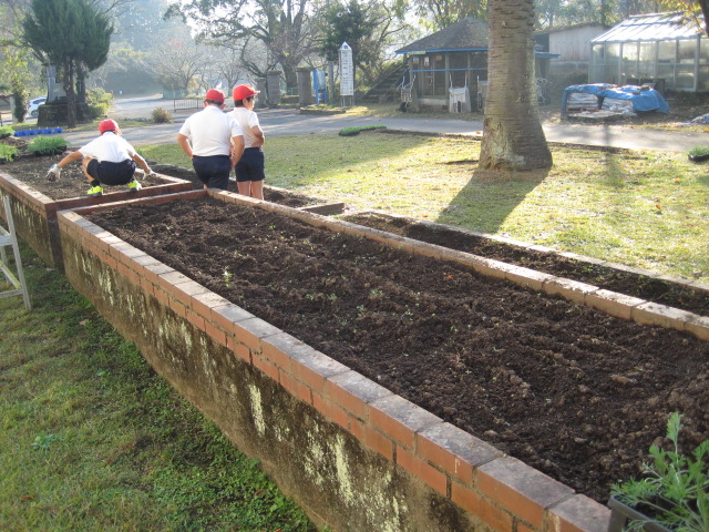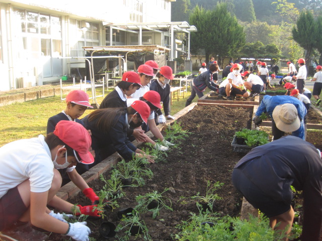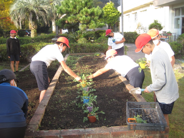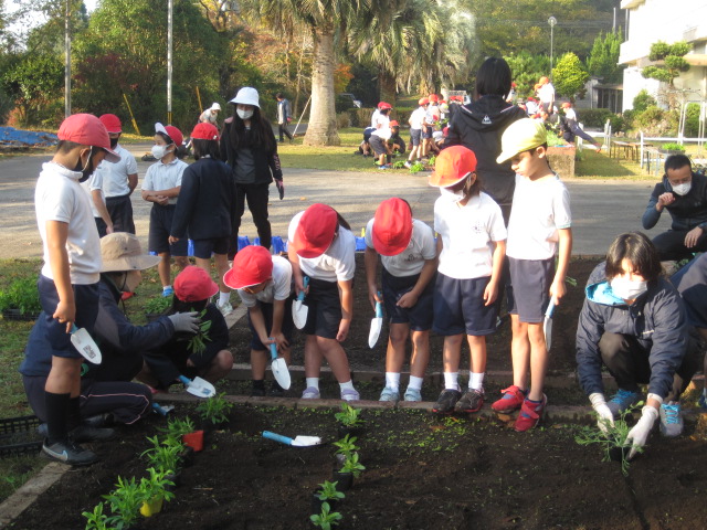 花がなくなってさみしかった学校園や学級園にこれから花をさかせる苗の植え付けを行いました。