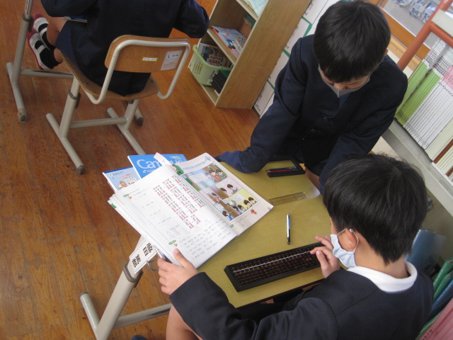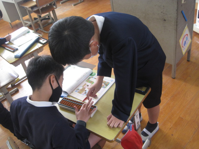 これもりっぱな一人一台端末です 作成者 matsuyamasyou_admin公開日 2022年1月13日 4年生が算数でそろばんの学習をしていました。一人一台タブレットの時代に,そろばんの学習のすることの意味を考えながら授業を参観しました。子供たちは,新しい道具を手に入れて,試行錯誤しながらもとても意欲的に学習に参加していました。友達同士で教え合い,学び合う姿も見られました。