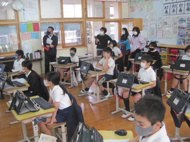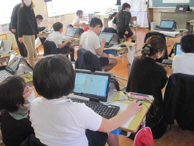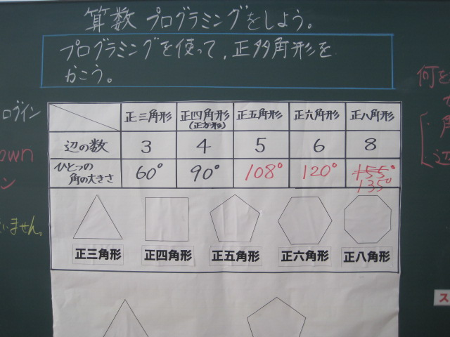 一人一授業~プログラミング学習③~ 作成者 Writer公開日 2021年1月27日2021年1月28日 5年生の算数で研究授業を行いました。スクラッチ(プログラミング学習ソフト)を使って多角形をかくという活動でした。スクラッチを使った2時間目の授業でしたが,子供たちの理解力,コンピュータスキルには感心します。内角と外角の関係を使うことを学習すると,自分たちでどんどん様々な多角形をかくことができました。終末には,「簡単に素早くかくことができた」,「角の数が大きくなればなるほど,円に近づいている」という振り返りをすることができました。新学習指導要領で導入されたプログラミング学習ということで職員の関心も高く,一授業を通して研修を深めることができました。