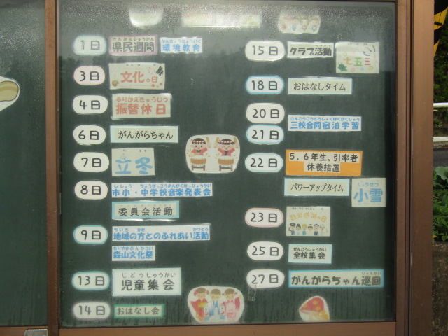森山小の正門を入ってすぐ左に掲示板があります。ここには、毎月の主な行事が掲示されるのですが、毎月欠かさず司書の山中先生が準備をしてくださいます。工夫を凝らした楽しい掲示板ですので来校の際には、ぜひご覧ください。