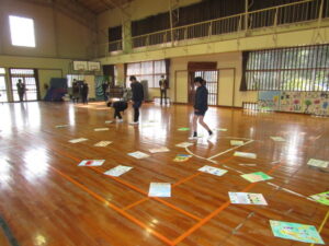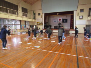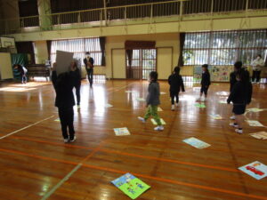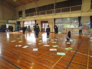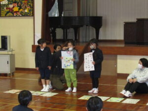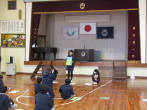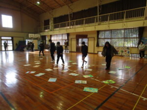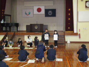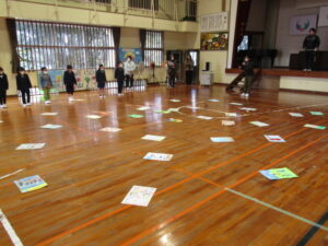 まずは、2校時の「森山かるた大会」の様子です。子どもたちは、最初に、図工の時間などに描いた、森山に関する大判のかるたを発表します。その後、お友達同士、子ども対大人の順番で、かるたを取り合いました。寒い中でしたが、大盛り上がりでした。