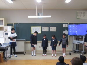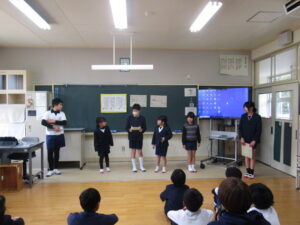 1月15日(水)、児童集会を行いました。今月の歌を歌い、1月のお誕生日紹介とインタビューのあと、「定番」の新聞紙じゃんけんをしました。各委員会からのお知らせは、時間の都合もあって、次の日の給食時間の放送で行いました。