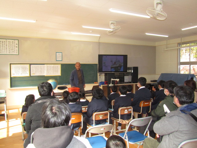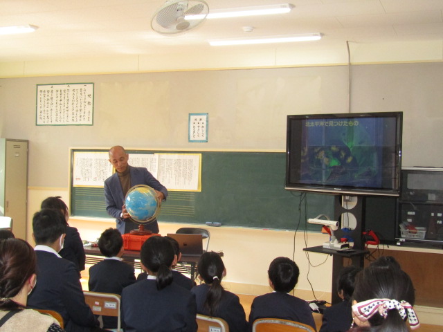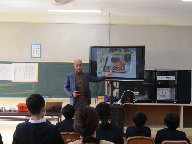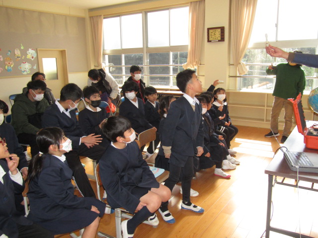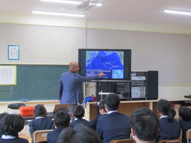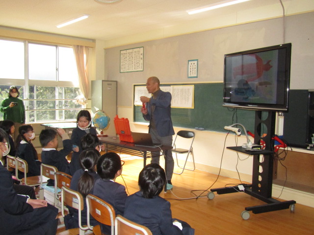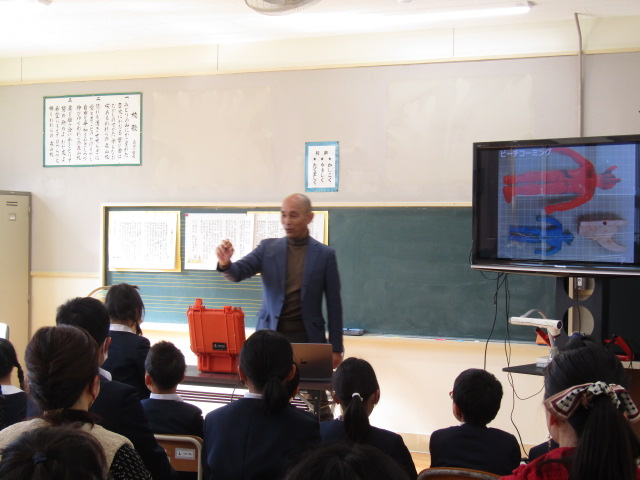 2月8日(土)、鹿児島大学南九州・南西諸島域イノベーションセンター長、藤枝繁 教授に森山小へお越しいただき、海洋ごみに関する出前授業を行いました。当日は、この冬最強寒波の影響が心配されましたが、森っ子や保護者、私たちの日頃の行いが良いため(笑)、無事に実施することができました。 児童にさまざまな海洋漂着物を紹介した後、海洋ごみが多量に漂流している北太平洋の海流について説明してくださいました。その後、ミッドウェー環礁を繁殖地とするコアホウドリの親鳥が、餌と間違えてプラスチックごみを食べ、それを与えられた雛が場合によっては死亡してしまうということを教えてくださいました。ミッドウェー島 - Wikiwand