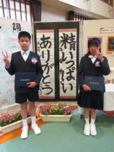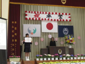 そして、「お別れの言葉」です。在校生全員で、心のこもったメッセージを二人に送り、卒業生もそれに応えました。言葉の最後には、難しい曲ですが一生懸命練習して、YOASOBIの「ハルカ」を全員で歌い、卒業をお祝いしました。