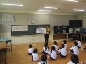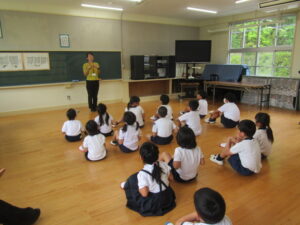 5月20日(火)、昼の活動で全校集会を行いました。校長先生と昼のあいさつをして、お話を聞きました。