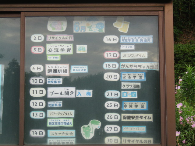6月の主な行事 作成者 moriyamasyou_admin公開日 2025年6月4日2025年6月4日 正門掲示板です。 来校の参考にされてください。プール開き・水泳学習は、市営温水プール(6/11,20)やB&G海洋センタープール(6/25)で行います。