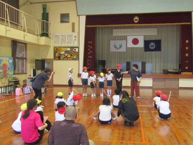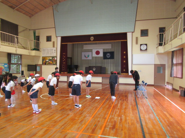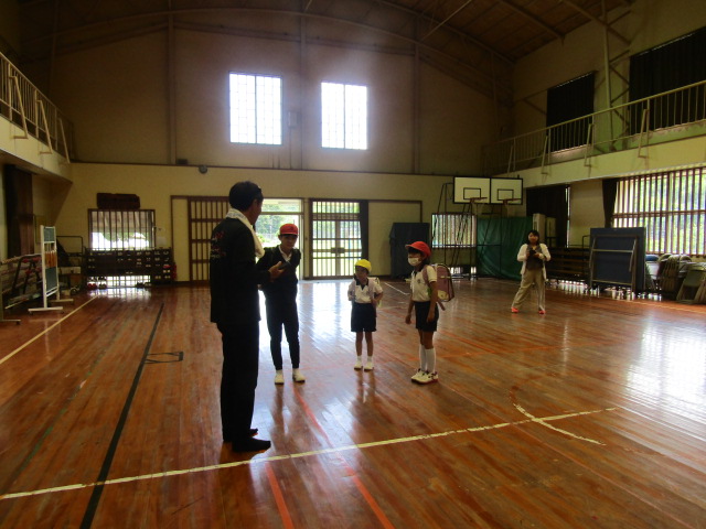 体育館に入る前は、校舎で「不審な来客」対応の演習を職員が行い、子どもたちは、その間に避難訓練をしました。