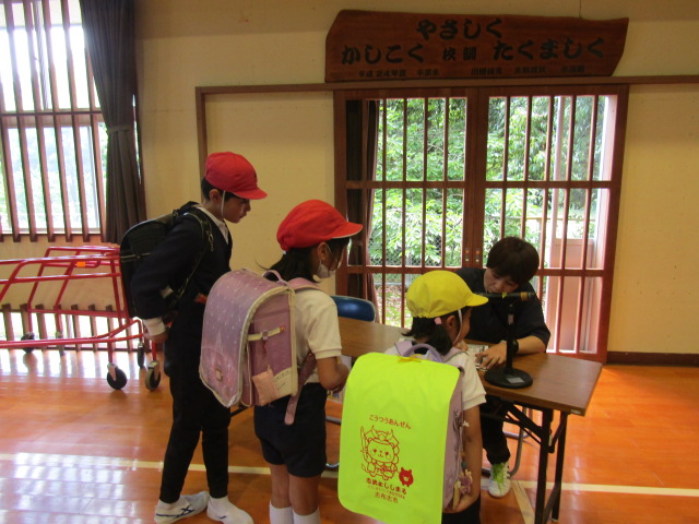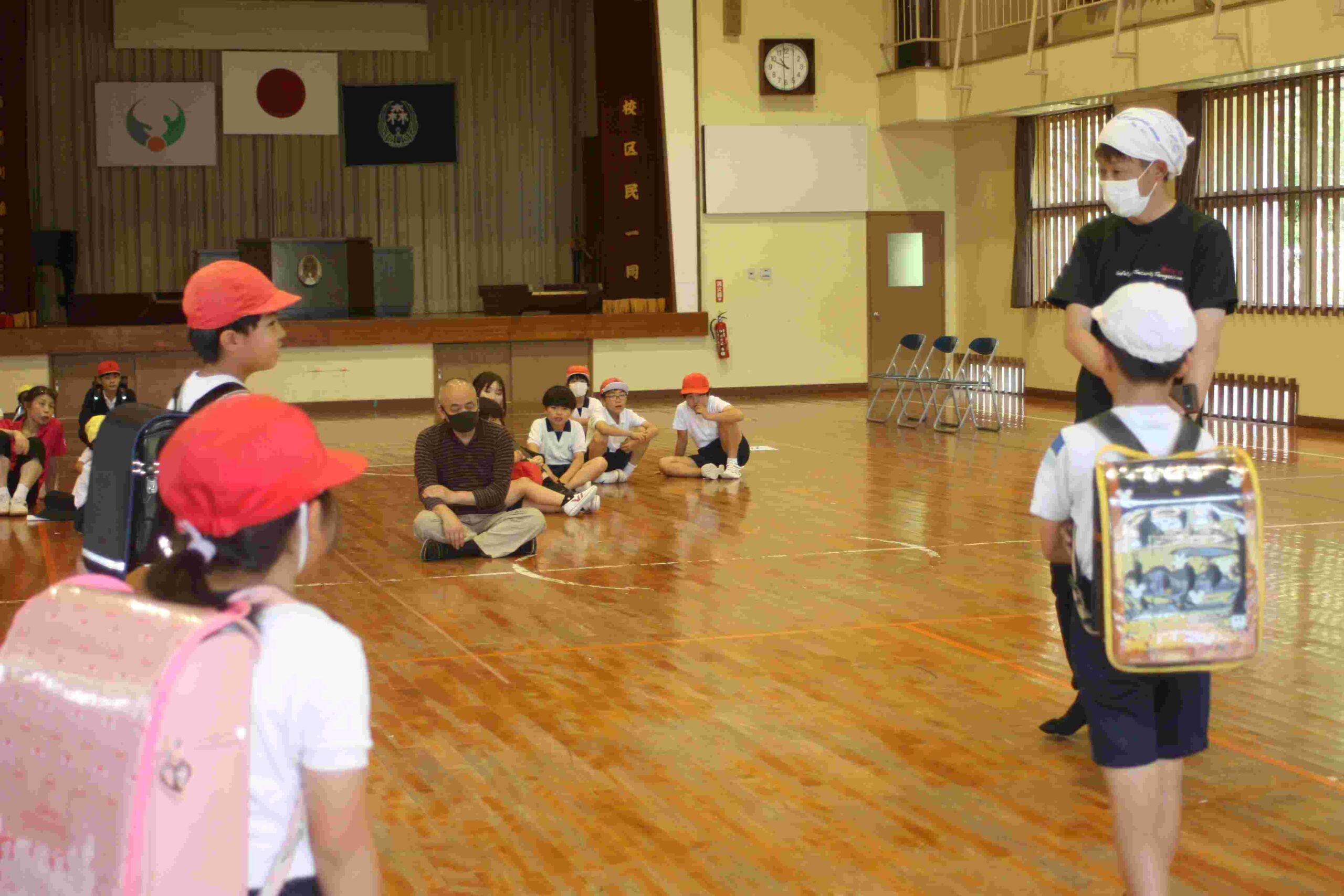 体育館では、変装して子どもたちに近づく「不審な人物」対応の演習をしました。6名の森っ子たちは、言葉巧みに近づいてくる「不審者」から逃げて、110番の家の方に特徴を落ち着いて伝えることができました。