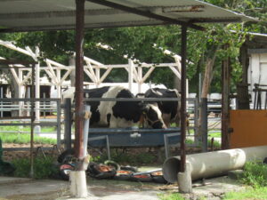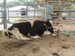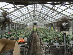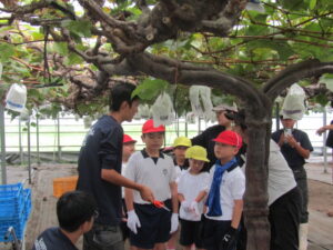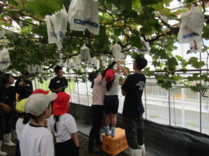 その後、上学年と下学年に分かれて、体験活動をしました。まずは、1~3年生のぶどうの収穫体験様子からどうぞ。牛さんや温室いっぱいの花を見学しながら移動しました。