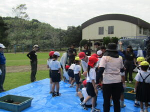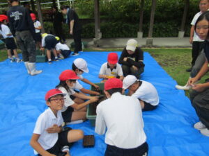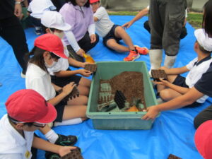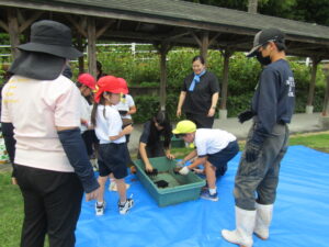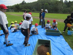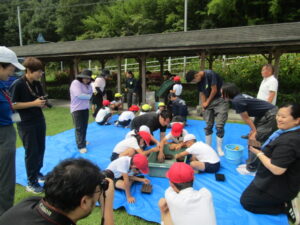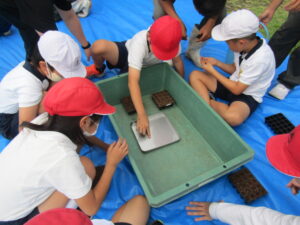 その後、小さな種を一粒一粒、セルトレイの中にまきました。1mm以下の小さな種を入れる作業で、森っ子たちは大苦戦しましたが、何とかできました。最後に、セルトレイの下に空いている穴から、土に水を吸わせて、「播種」完了です。いっぱい芽が出るといいなぁ。