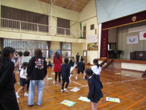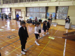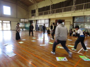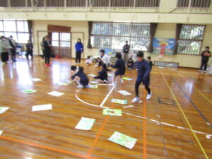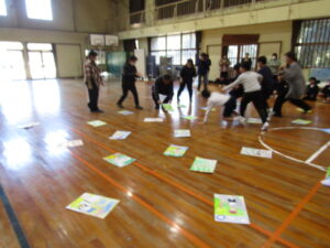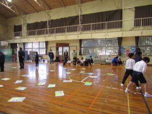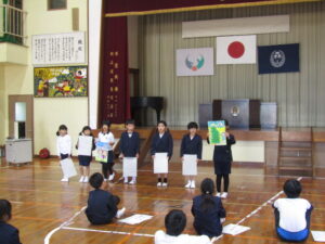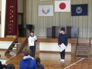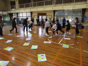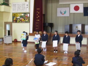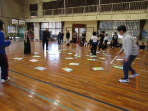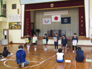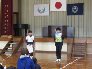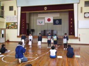 1月9日(金)は毎年恒例になっている校内かるた大会でした。森山小にちなんだ、子どもたちお手製の「森山かるた」を使ってのかるた取り合戦です。 まず始めに、自分たちで作ったかるたを発表しました。