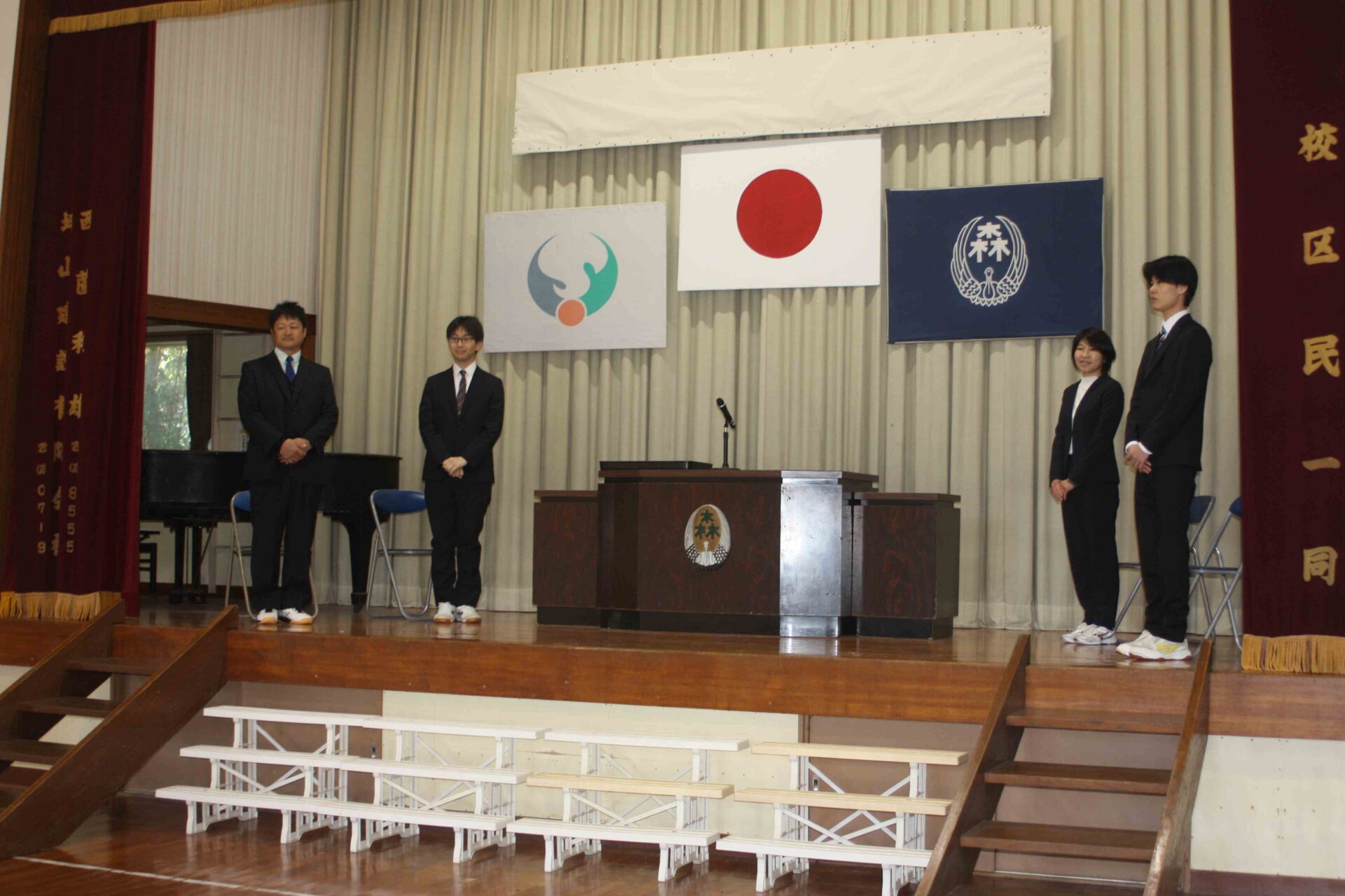 3月に卒業生や先生が森山小学校を出られて、寂しい思いをしていましたが、今年度4名の先生方が森山小に来られ、新しい友達も3人増えました。新任式では、新しく来られた先生方を紹介した後、お一人ずつご挨拶をいただきました。最後に代表児童が、歓迎の言葉をしっかり伝えることができました。