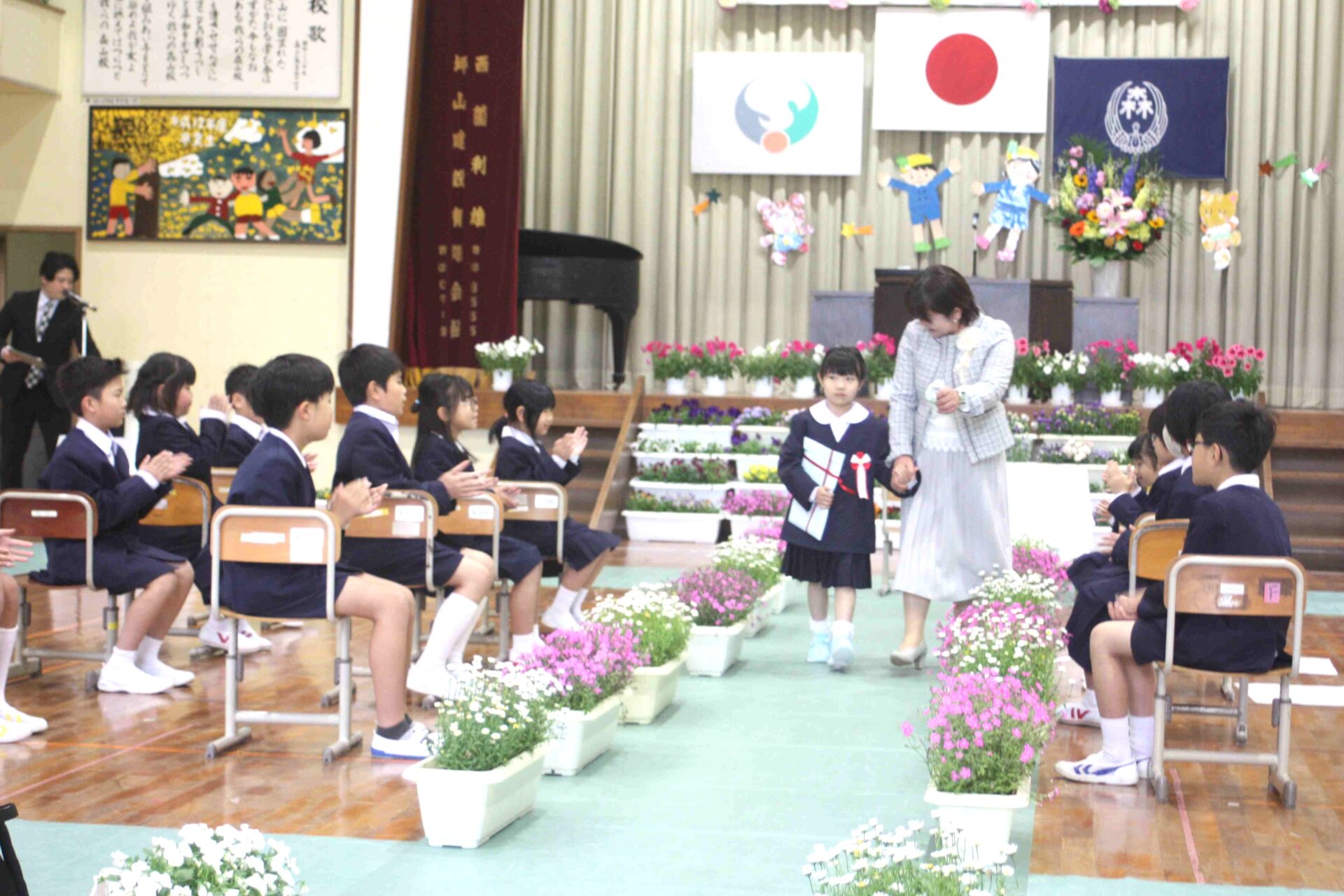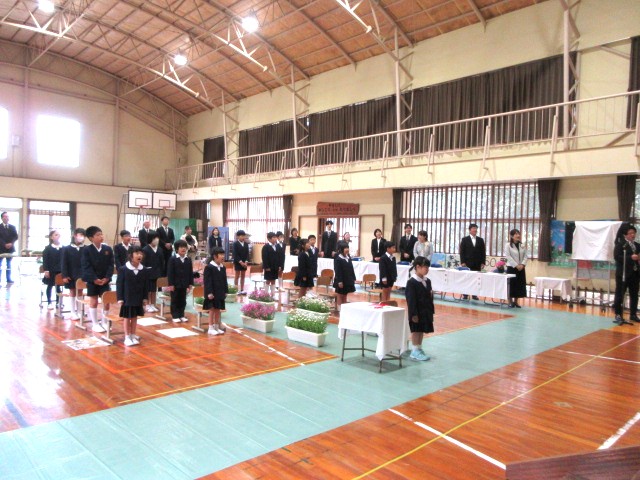 令和8年度入学式 作成者 moriyamasyou_admin公開日 2026年4月10日 4月9日、令和8年度入学式を行いました。 今年度の新1年生は1名でした。担任の先生と手をつなぎ、笑顔で入場してきました。名前を呼ばれたときに元気よく返事をし、お祝いのことばでも「ありがとうございました」をしっかり伝えることができました。 2・3年生はお迎えのことばで、学校紹介をしてくれました。早速、お兄さん、お姉さんとして、1年生をサポートしようという気持ちがみられました。 今日で、森山小学校全校児童17人がそろいました。『元気もりもり、森山小学校』で、みんなで楽しい学校生活を送っていきます。