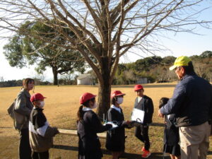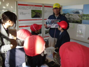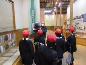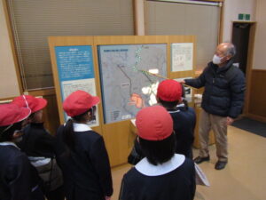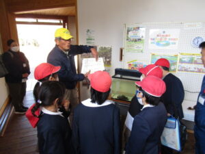 生物多様性センターの後は、近くの開田の村の見学もしました。この施設には、明治・大正・昭和の時代に蓬原・野井倉開田事業に携わった偉人「馬場藤吉翁・野井倉甚兵衛翁」の功績をたたえ、開田の歴史やその工事の画像、実際に工事に使われていた道具、野井倉甚兵衛翁が書き残した手帳等が展示されています。