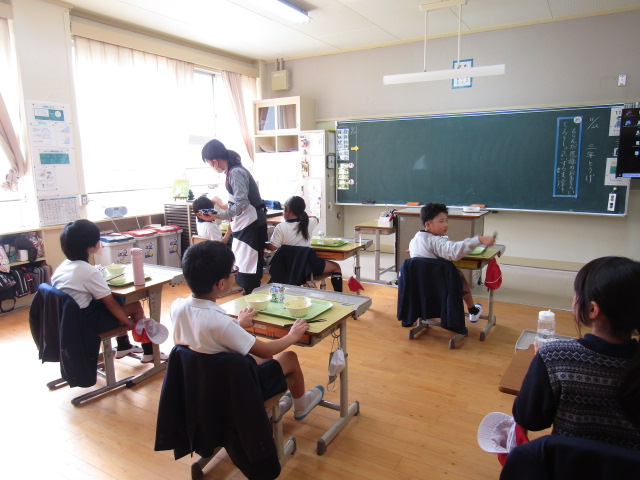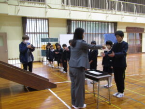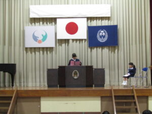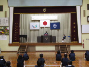 12月24日(水)、2学期の終業式を行いました。雨が降ったりやんだりで、少し暖かい日でした。いつもの終業式より、寒くなくて良かったです。 最初に、1年生と3年生の代表が、2学期の反省や冬休みの目標、楽しみについて発表してくれました。