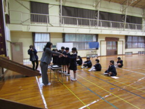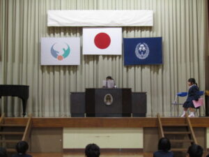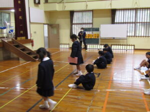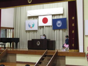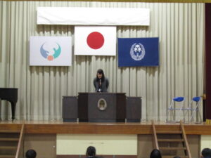 次に、校長先生から、2学期目標「だいすきみんな」(学校教育目標の2つ目)の頑張りについて誉めていただき、冬休みの過ごし方についてお話しがありました。