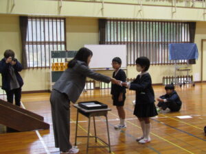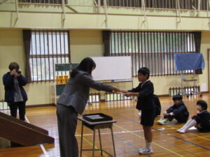 終業式のあと、表彰式を行いました。森っ子たちは、たくさんの賞状(もりやま100冊達成者、もりやま漢字検定)をもらいました。