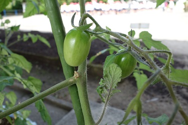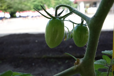 2年生が育てているミニトマトがぐんぐん育っています。実も大きくなってきました。