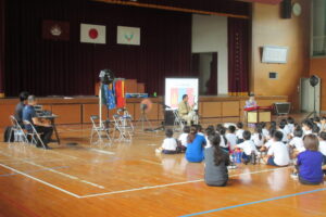 7月11日(木)に芸術鑑賞会がありました。馬頭琴のや横笛リンベ,ヨーチンといった楽器の音色を鑑賞しました。実際に代表の子供が馬頭琴を演奏したり,モンゴルの民族衣装を着てみたりする体験もあり,モンゴルを感じることができた鑑賞会でした。