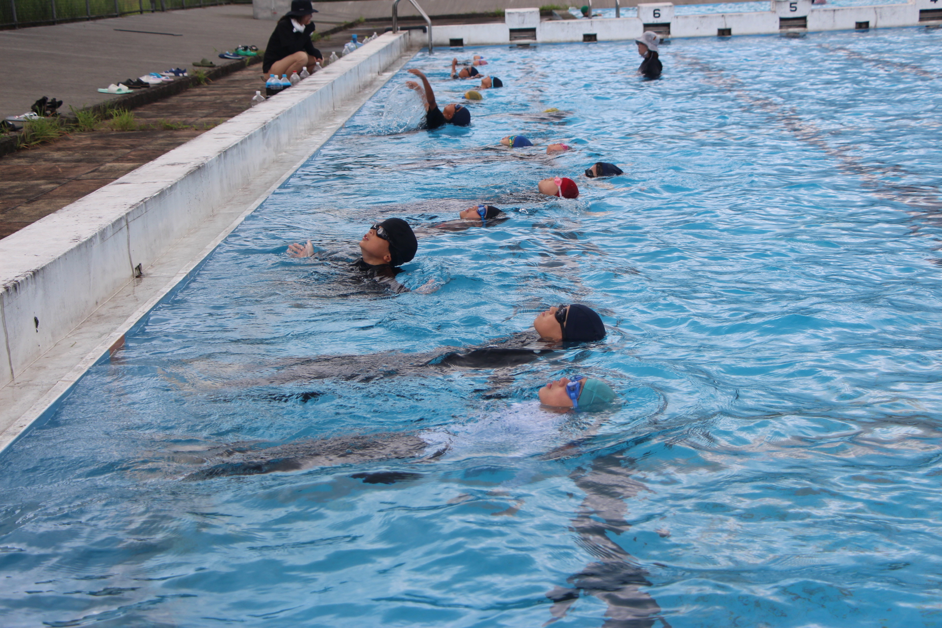 小プールでみんなで走り、水の流れをつくりました。川や離岸流など、流れに逆らうことは難しく、体力も使うことを体験しました。