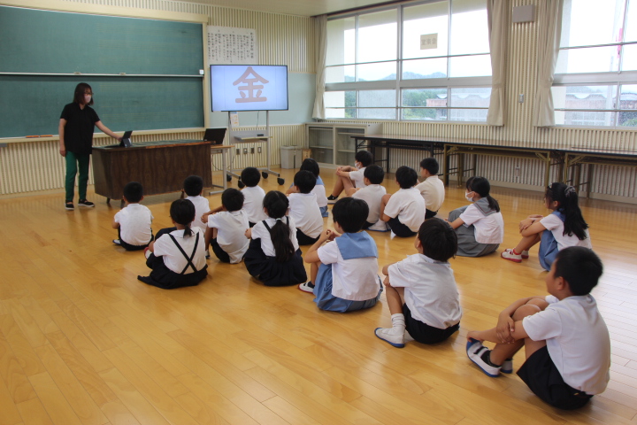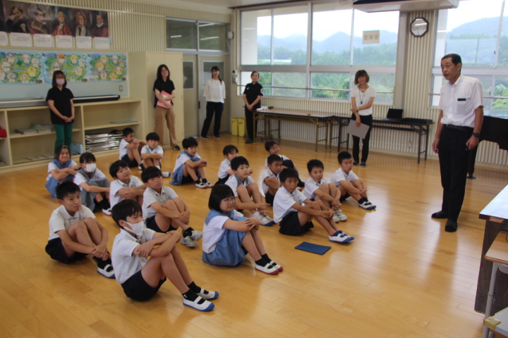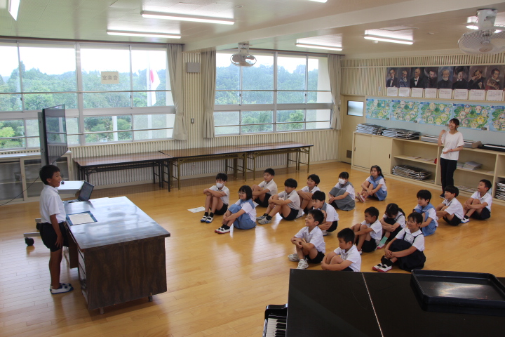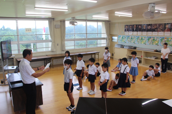 次は,「校長先生のお話」。全校児童17名の写真を見せながら,1学期に頑張ったこと・成長を振り返りました。みんな真剣に集中して話を聞いていました。