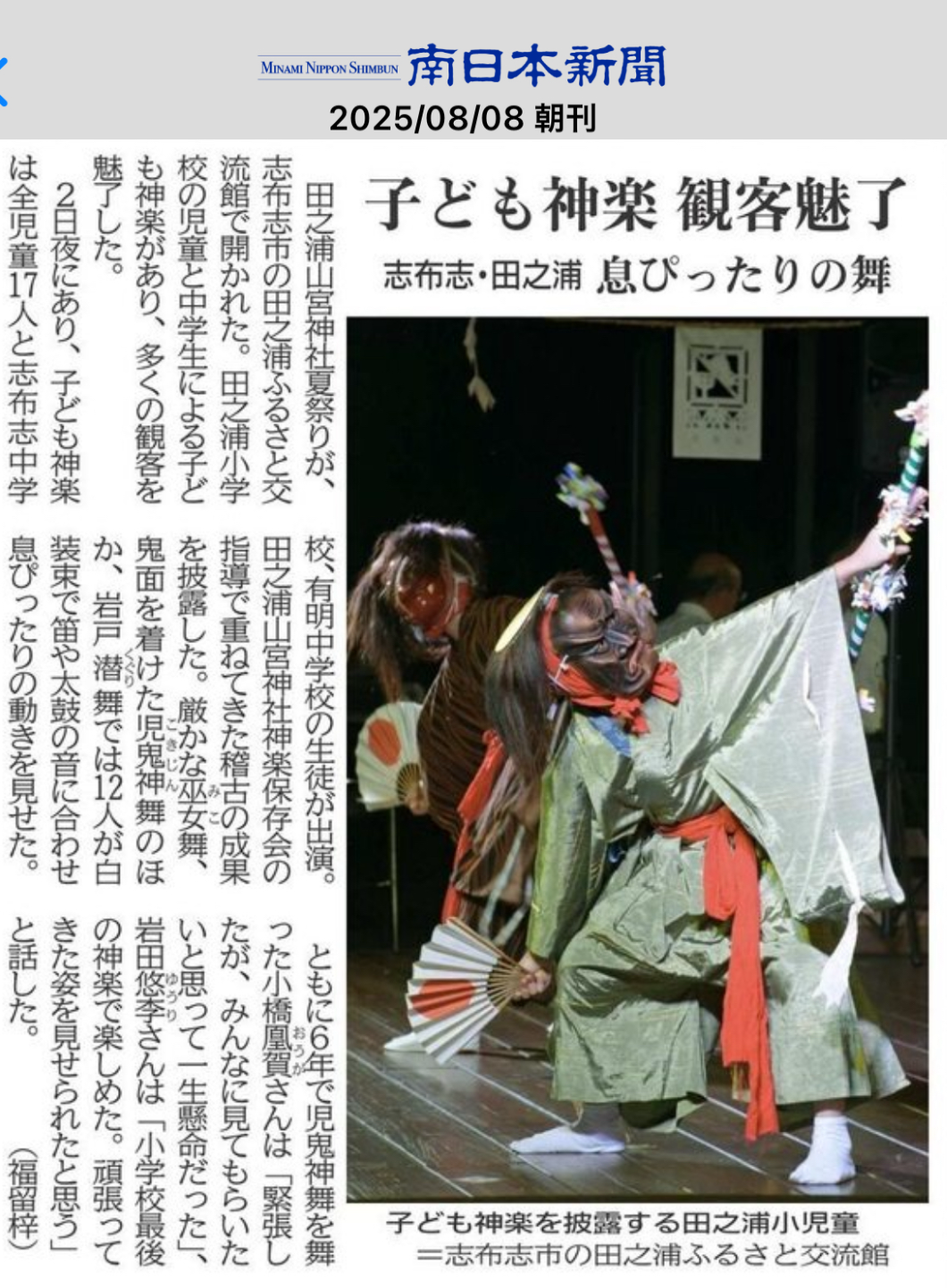 8月8日 南日本新聞 記事の紹介 作成者 tanourasyou_admin公開日 2025年8月10日2025年8月22日 8月8日の南日本新聞朝刊に,田之浦山宮神社夏祭りでの子供神楽の様子が紹介されました。子供たちの4つの舞も,2人のインタビューも立派でした。