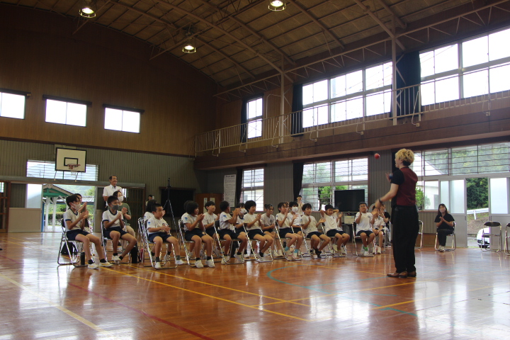 来校してくださったのは,鹿児島市在住のプロパフォーマー・K@ITOさんとスタッフさん4名。第1部では,パフォーマンスショーとして,手品やジャグリング&楽しいトークで盛り上げてくださったり,子供もパフォーマンスに参加したり,水晶やLEDライトを使った神秘的なパフォーマンスを披露してくださったり…。あっという間の1時間でした。
