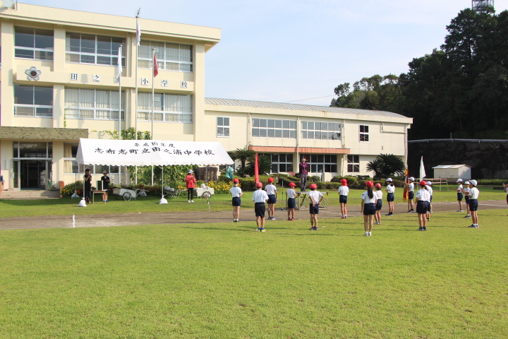 大運動会に向けた全体練習が始まりました。今年度は,創立150周年の節目の年なので,「田之浦小学校創立150周年記念地域合同大運動会」と銘打っています。150周年にちなんだ特別種目やドローン記念撮影も計画しています。