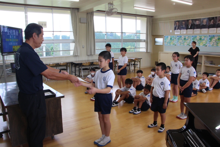 10月1日(水),全校集会を行いました。まずは,表彰式。作文コンクールと健康に関する標語の表彰を行いました。作文は大隅地区の特選,標語は曽於地区の特選となり,上位入賞が続いています。みんなの頑張りが結果にも表れ,嬉しいです。