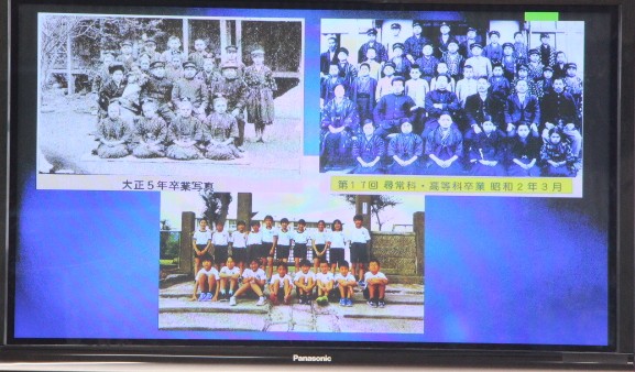 表彰の後は,「校長先生のお話」として,田之浦小の150年の歴史について聞きました。田之浦小ができた明治時代の話から始まり,大正,昭和,平成,令和の変化を写真をもとに振り返りました。150年の重みを感じます。