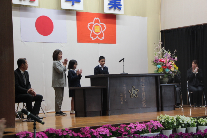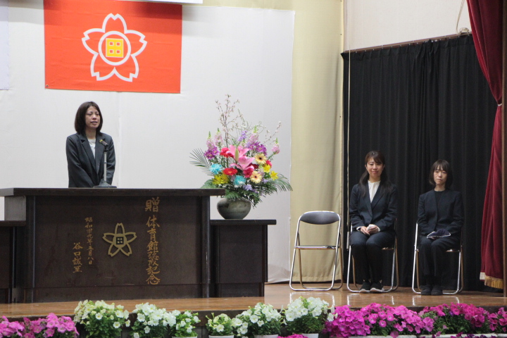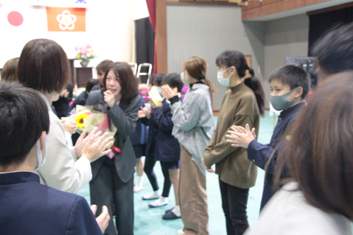 離任される先生方からは、子供たちへの励ましの言葉や、これまでの思い出が語られました。「泣かないぞ」と思っていた先生方も、思わず涙ぐむ場面が続きました。子供たちは、感謝の気持ちを込めて真剣に耳を傾けていました。